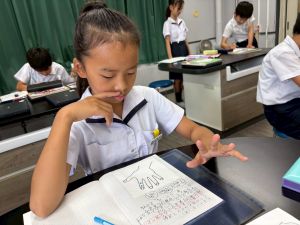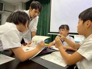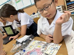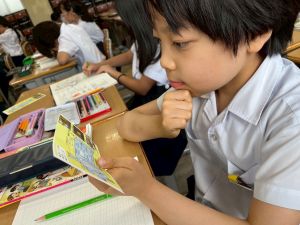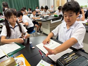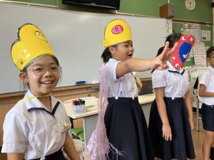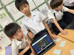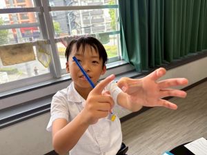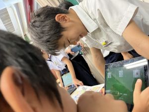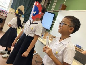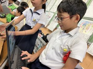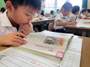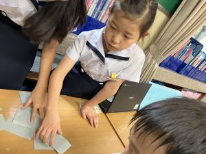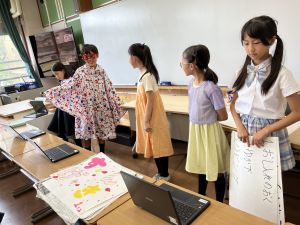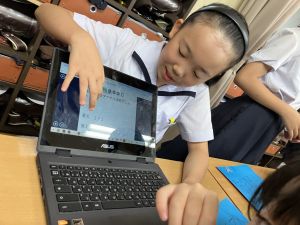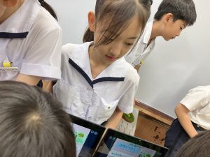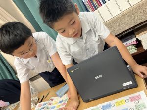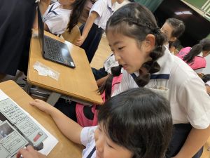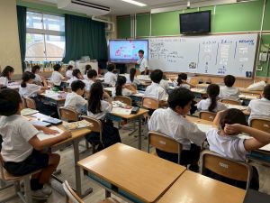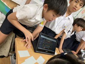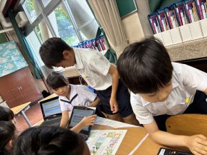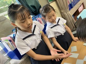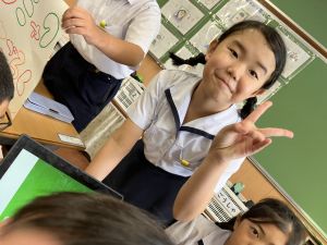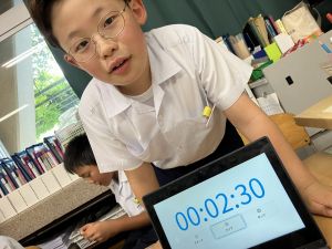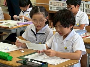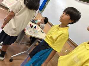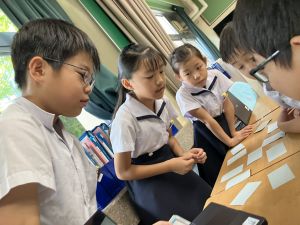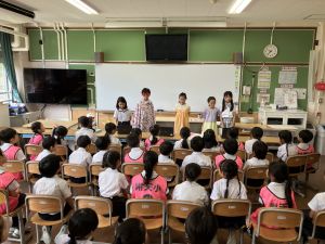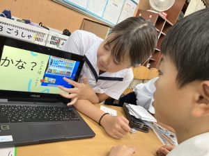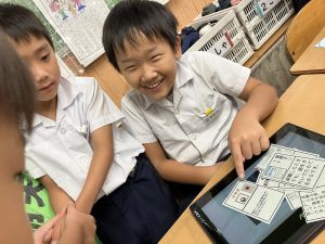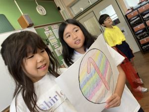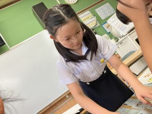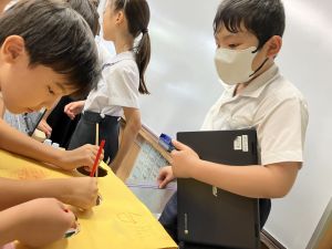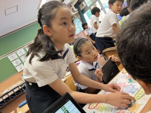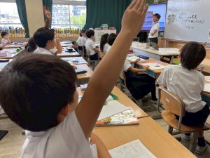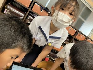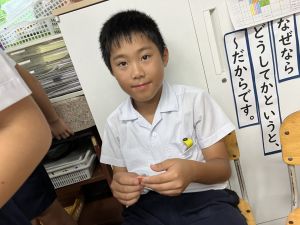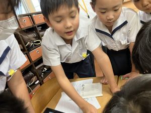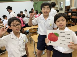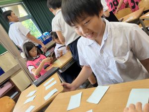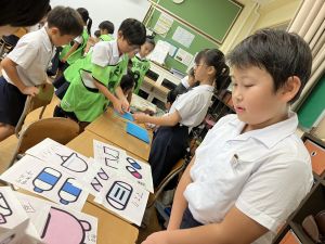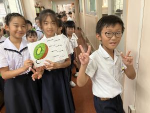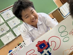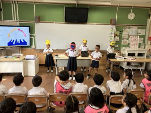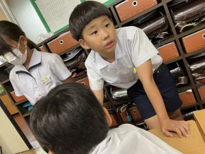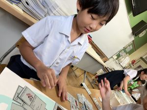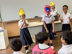 15分3回転のお店屋さんを、どの子もどのお店も粘り強く活動しておりました。おもてなし担当の子たちも、教師が声をかけるわけではなく、自分たちで時計を見ながら声をかけて盛り上げたり連れていったりしていました。次の活動が時間通り始められるように、あと何分なのか見通しをもたせたり、3分前から声をかけて導いていくチームも見られました。