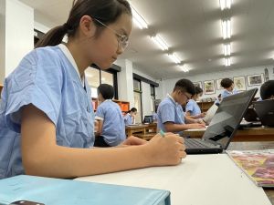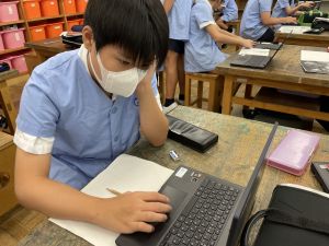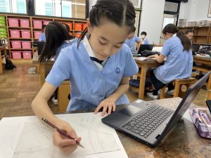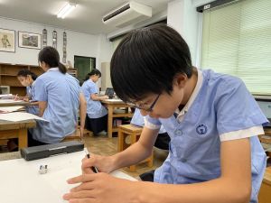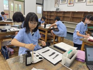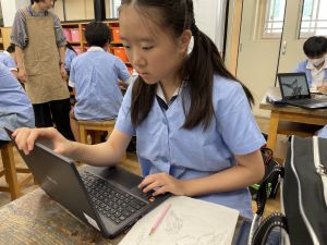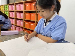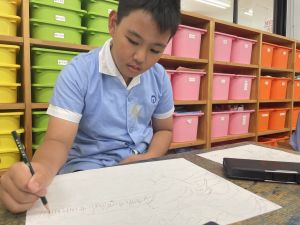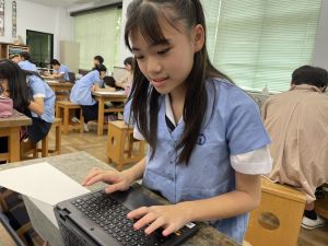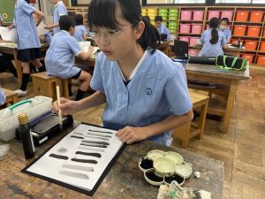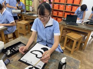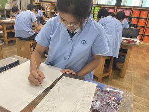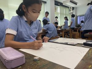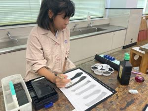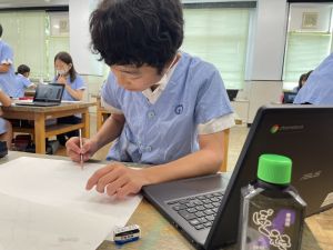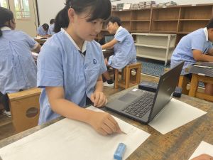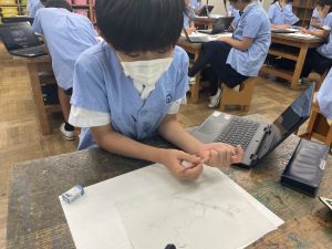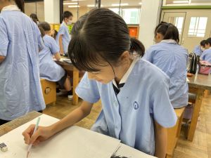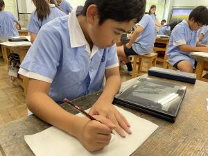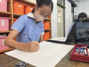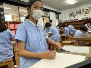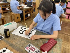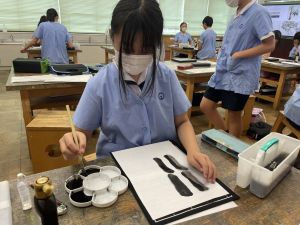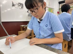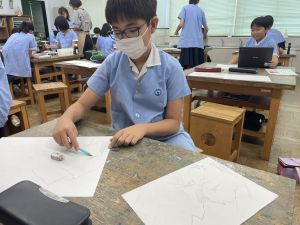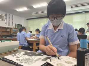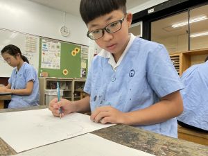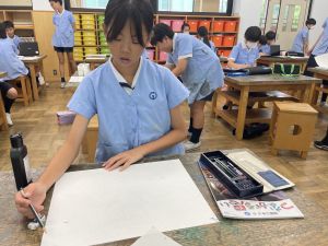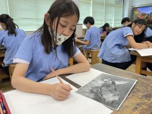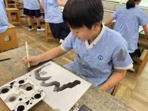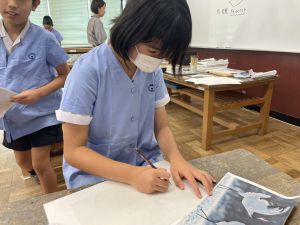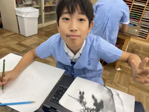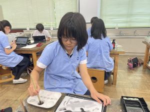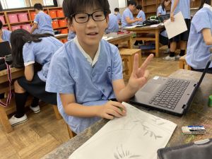 今日は図画工作で、アート展に向けて水墨画の制作を進めています。題材は「未来へ羽ばたく6年生」をイメージし、鳥をモチーフとしています。
