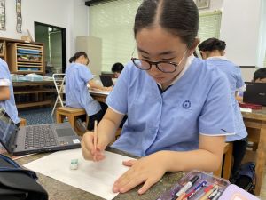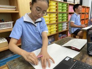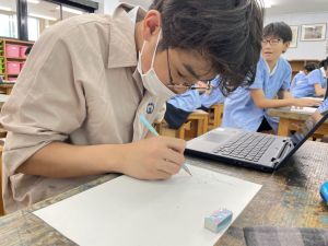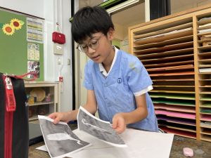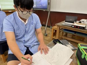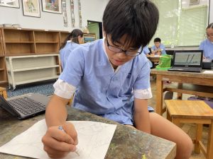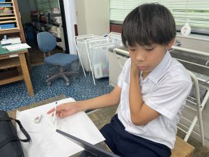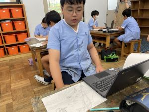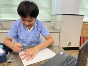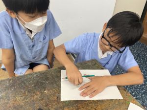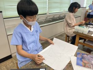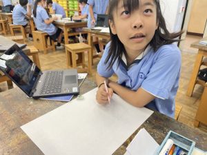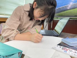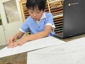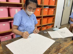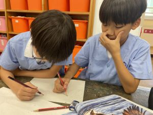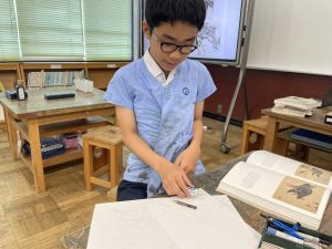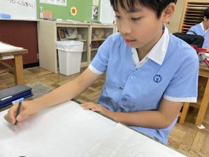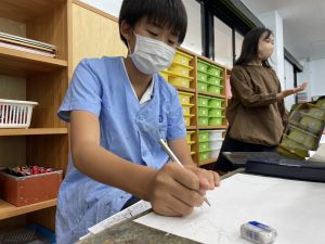 ホトトギスやスズメのように小さく可愛らしい鳥を選ぶ子もいれば、タカやトンビのように大きく力強い鳥を描く子もいて、それぞれの個性がよく表れていました。背景には、お寺や神社の鳥居などの建物や、豊かな自然を描き込むなど、一人ひとりが工夫を凝らして下書きを進めています。