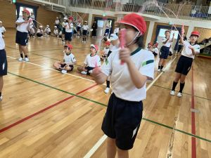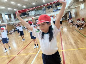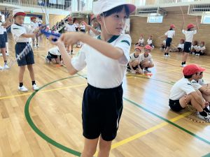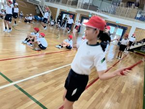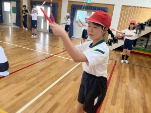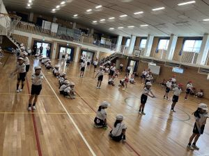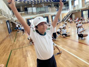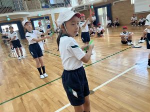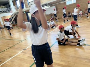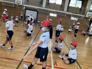 5時間目には、体育館にて音楽に合わせられるように練習していきました。運動場と比べ、体育館は狭いので学年全体ではなくクラスごとの練習となりました。それでもなかなか疲れてしまいます。