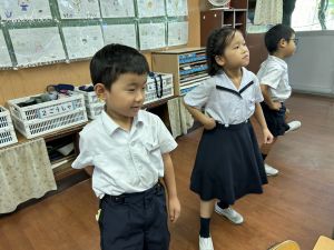 「ヨ」を書いているつもりが、左右反転して「E」のようになってしまう子がいます。これは鏡文字と呼ばれるもので、空間認識や文字の形の理解が発達途中であることが原因と考えられます。ご家庭でも、ゆっくり丁寧に文字の形を確認しながら練習していただけると助かります。
