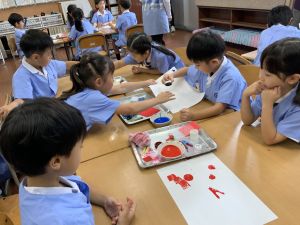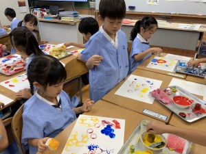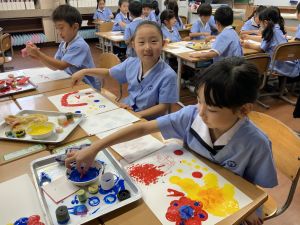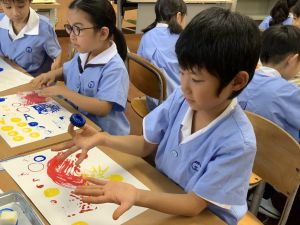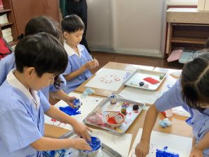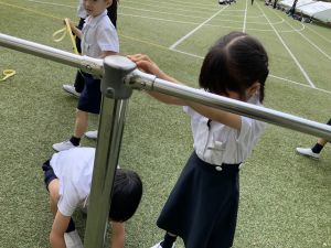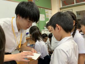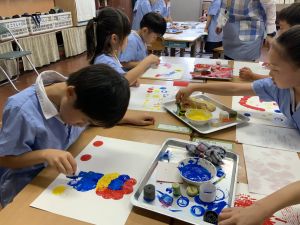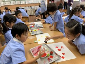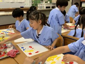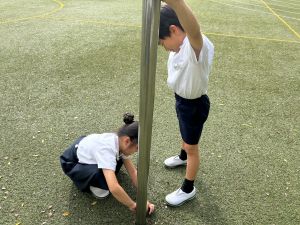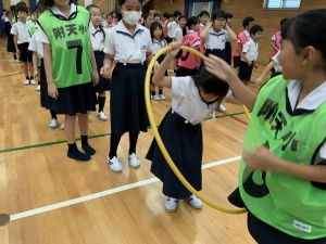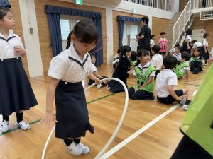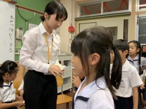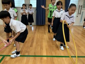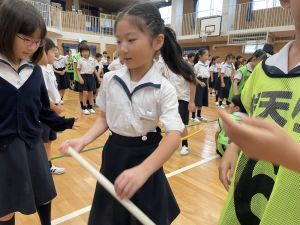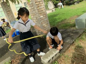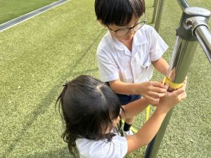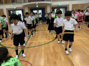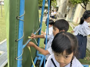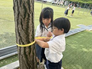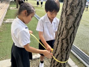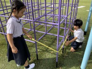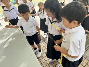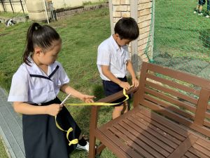 算数の時間には、テープを使って、普段では測ることのできない大きなものの長さを測りました。活動の前に「どれくらい長いのか」「どちらが長いのか」を予想し、量感を意識しながら学習を進めました。