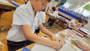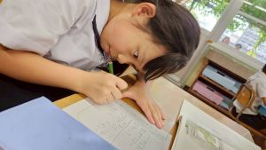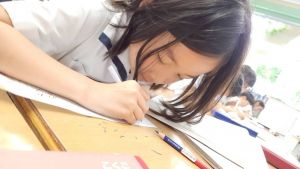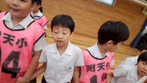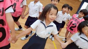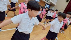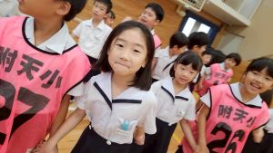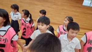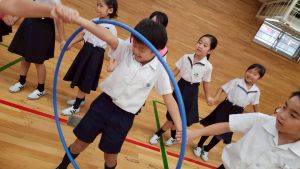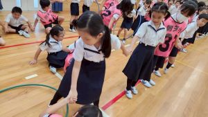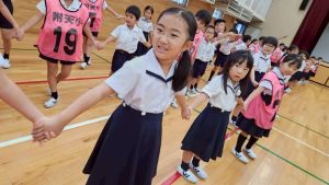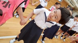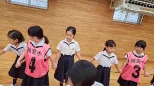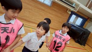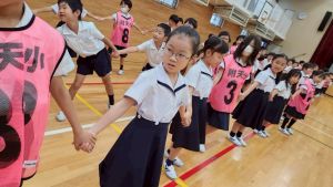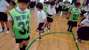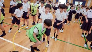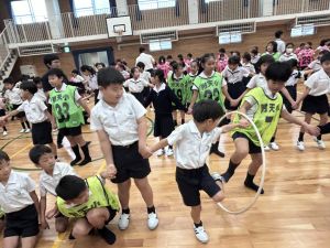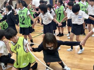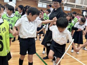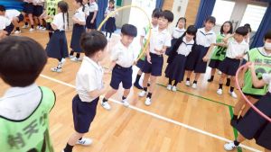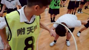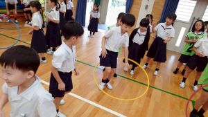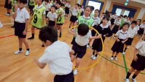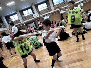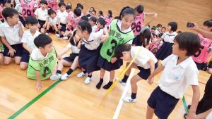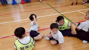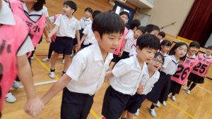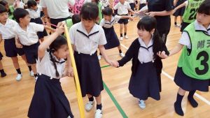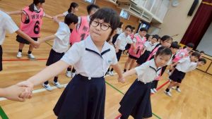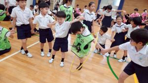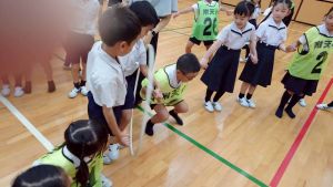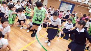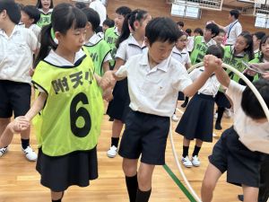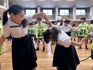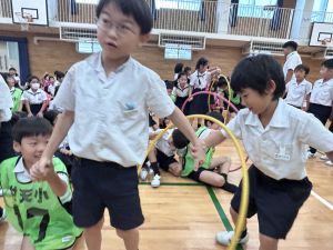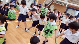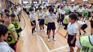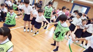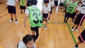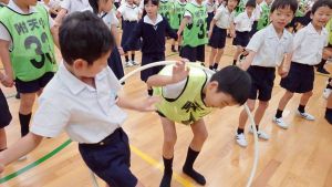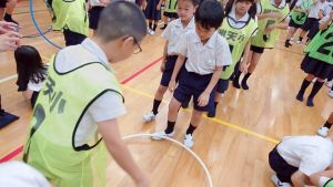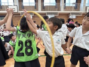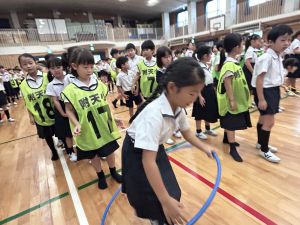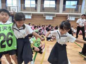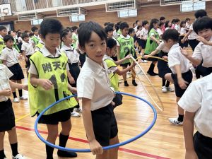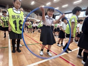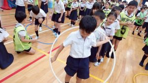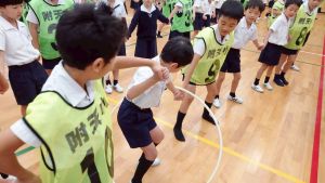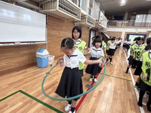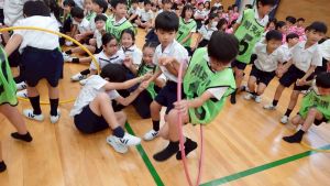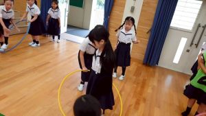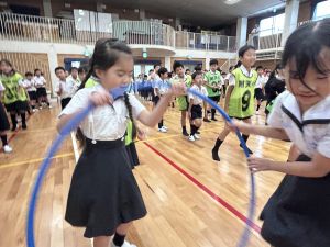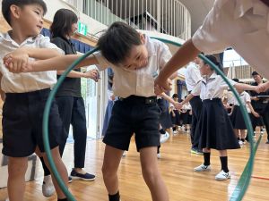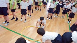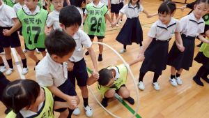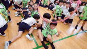 今日は雨天のため、トリオ活動を講堂で行いました。トリオのチームで1列に並び、行った競技は「フラフープリレー」!