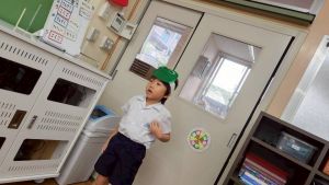 2回目は、横を向き、隣の人と手を繋いで、みんなで一本のロープのようになりました。そして手を繋いだまま、後ろから前へフラフープを回していきます。1回目と違ってこちらはお友達との距離が近くないと、手が離れそうになって、やりにくそう。どちらもみんなで協力してやっと、ゴールできるルールでした。雨でも仲良しのトリオメンバーがいるので、ワクワク楽しい時間が過ごせました。