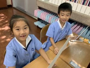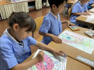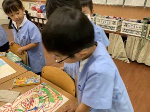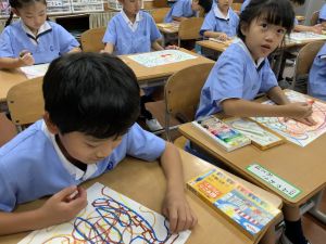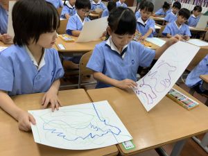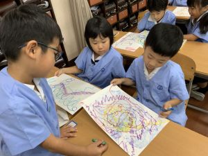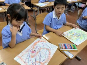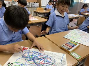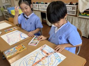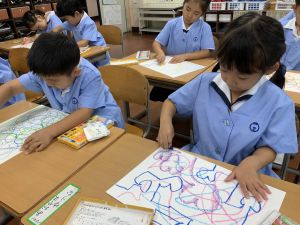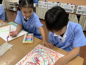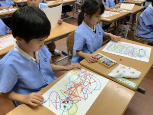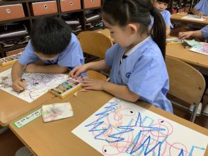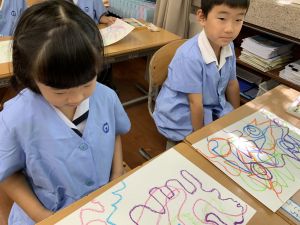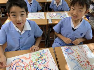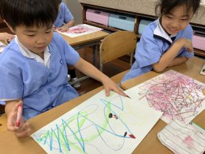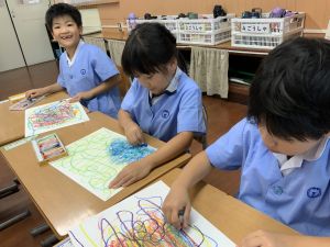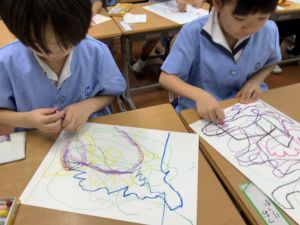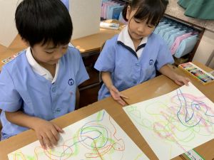 1本ずつ線を描く時の条件を変えて4・5本の線を描きました。描いた後で画用紙の向きを変えたり友だちと線を見せあったりしていると色々な新しい見方が出てきます。