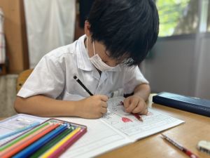 子どもたちは、競技で感じた達成感や、仲間と協力した場面を思い出しながら、自分自身と向き合う時間を過ごしました。「かけっこで最後まで走り切れて1位になれて嬉しかった」「ミャクミャクダンスでみんなと息を合わせられた」「大屋根リングをみんなで作ることができて嬉しかった!」など、一人ひとりが自分の頑張りを言葉にし、丁寧に書き記していました。