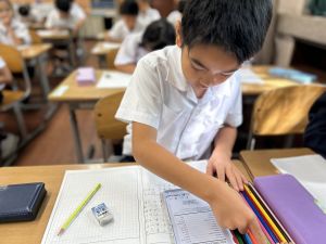 今日は、スポーツデーを振り返る時間を取り、キャリアパスポートに自分の成長や頑張りを記録しました。