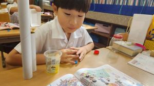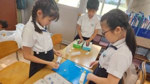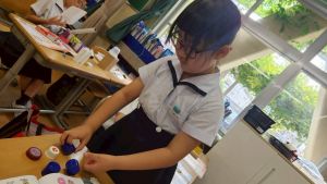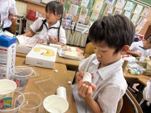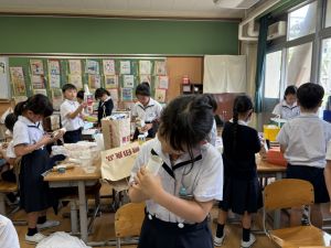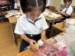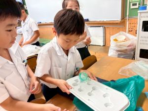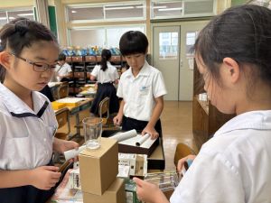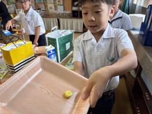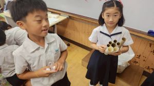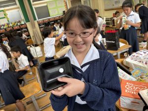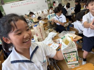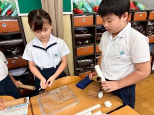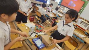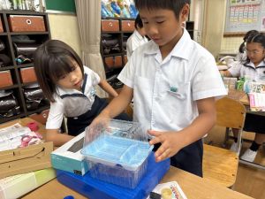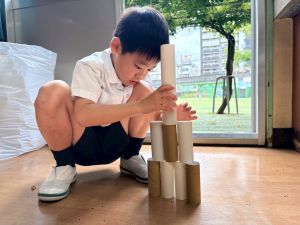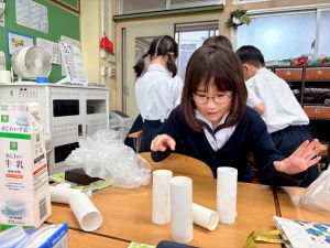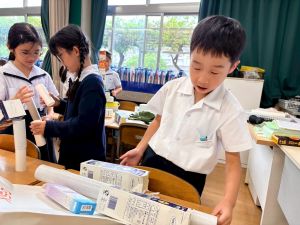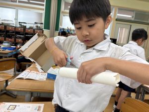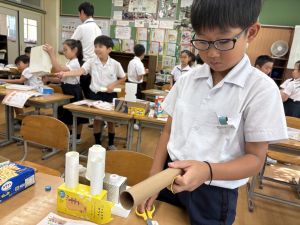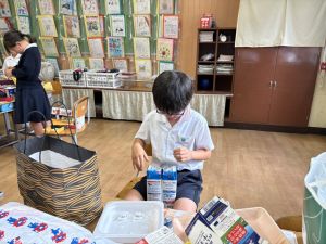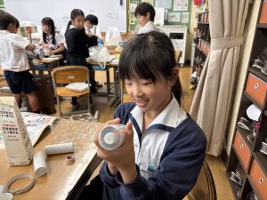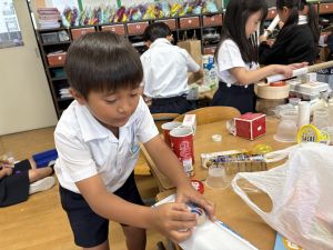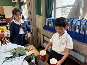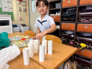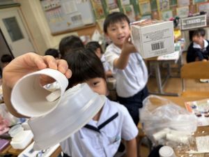 自分たちでおもちゃを作り、そのおもちゃを遊んでいただくということにチャレンジしようと思っています。だから、たくさんの箱やトレー、キャップ、カップなどをつかって、これからおもちゃを作ります。