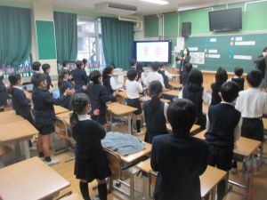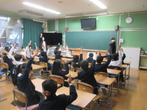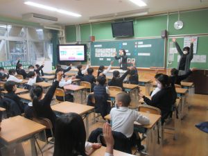 クリス先生の自己紹介を聞いてクイズに答えたり,歌を歌ったり,体を動かしてジェスチャーゲームをしたりと,自然なかたちで英語に親しむ活動を行いました。