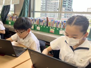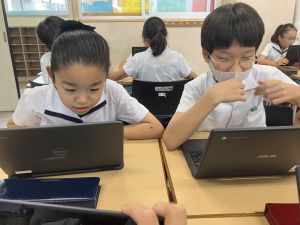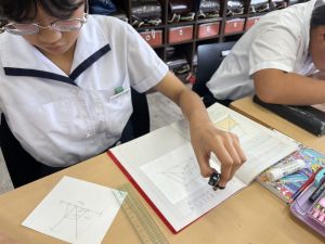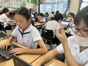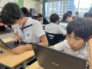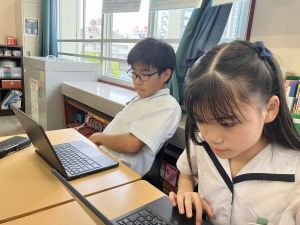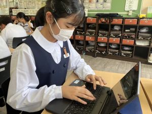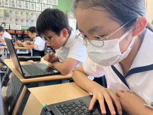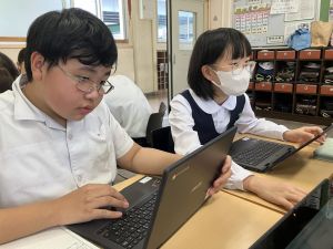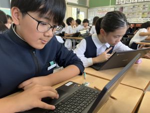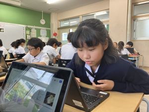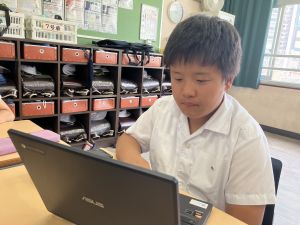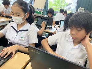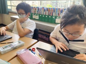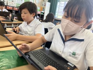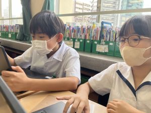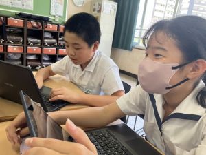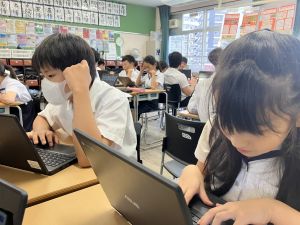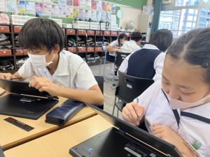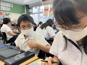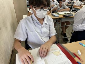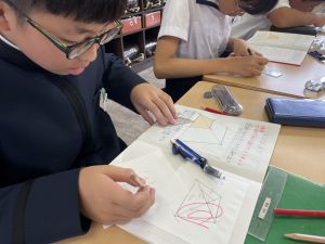 算数科の学習では,「拡大図と縮図」の作図に取り組んでいます。教科書にある方法だけでなく,図形の内側や外側,辺の上に中心の点を決めて様々な方法で作図しています。1回でできなくても,何度もチャレンジすることでできるようになってきています!