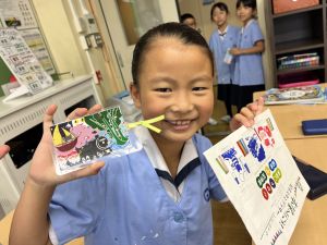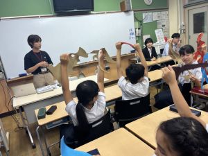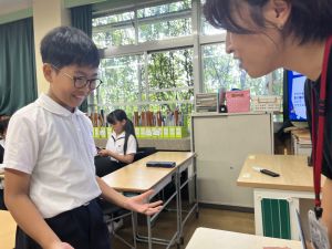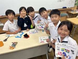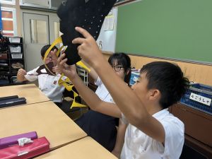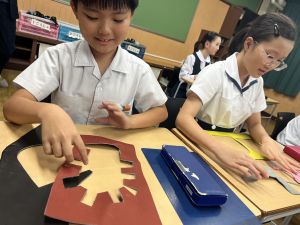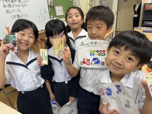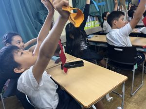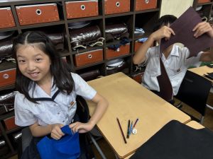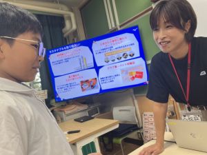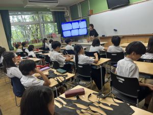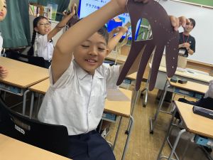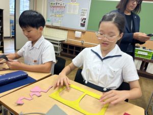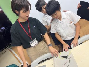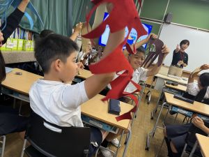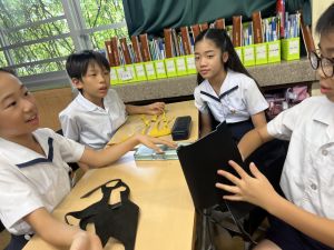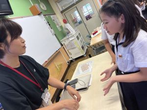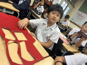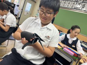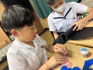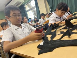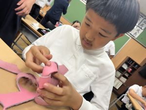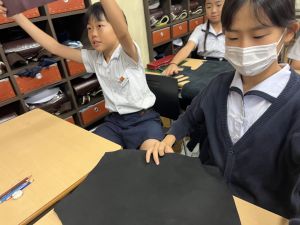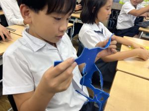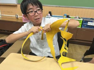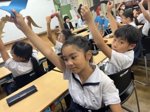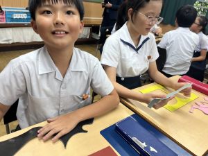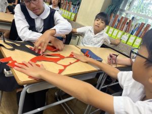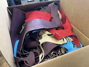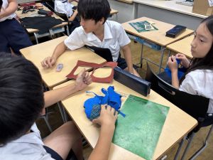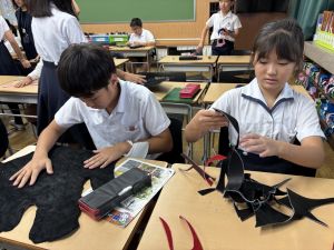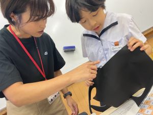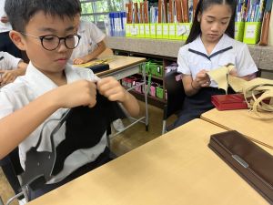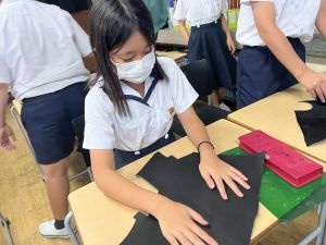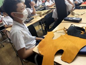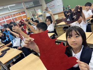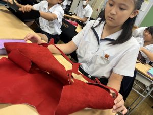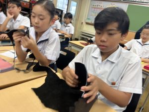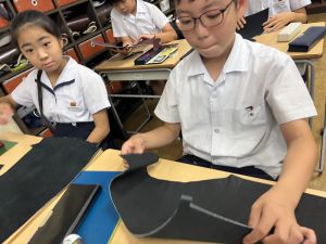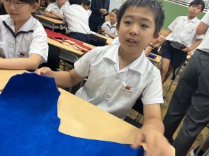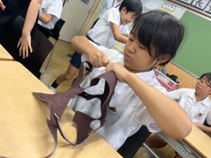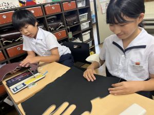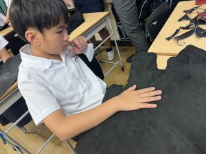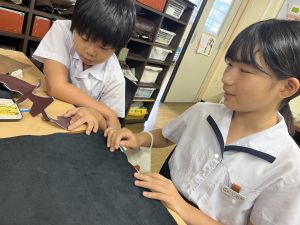 本物の皮素材に触れ、アイデアを膨らませる子どもたち。