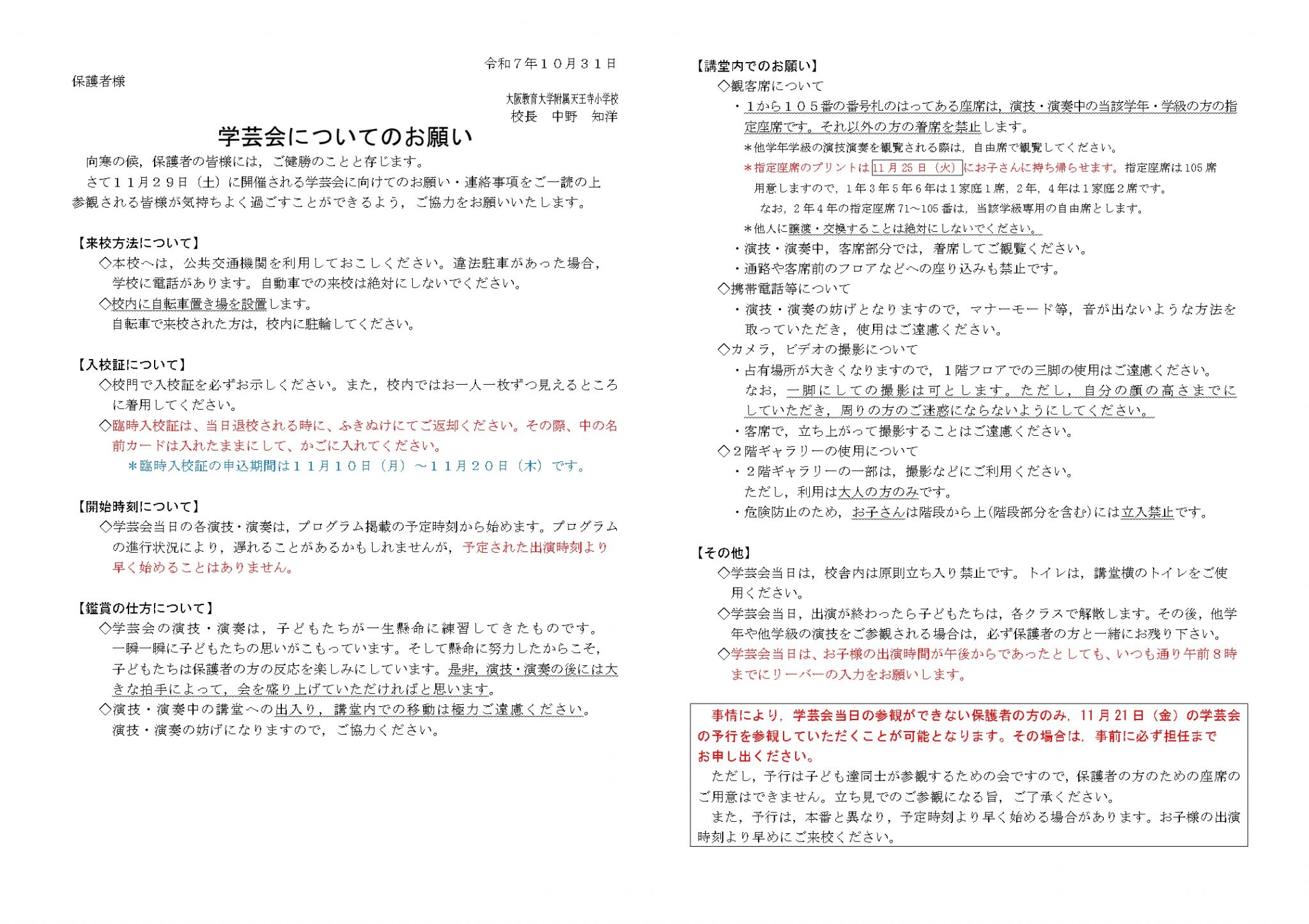 2025.学芸会について 2025.10.31 行事関係 PDFはこちら « 前へ 一覧へ 次へ » 関連する記事 (連絡)学芸会用臨時入校証について 2025.11.10 行事関係 2025.学芸会について 学芸会についてのお知らせ 2025.10.31 行事関係 (重要)スポーツデー連絡事項 必ずお読みください 2025.10.08 行事関係 スポーツデーに関するお願い【直前版】 2025.10.03 行事関係 保護者専用 お知らせ 1年生 2年生 3年生 4年生 5年生 6年生 落とし物 各種募集 行事関係