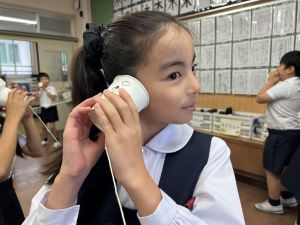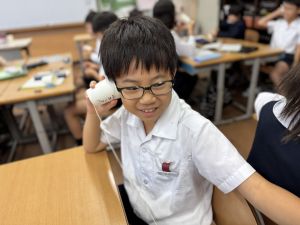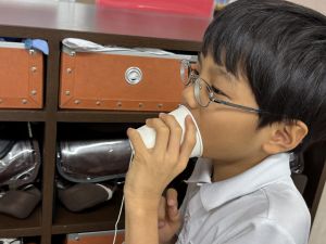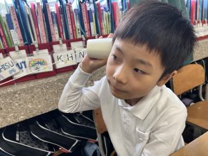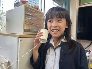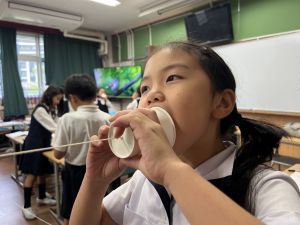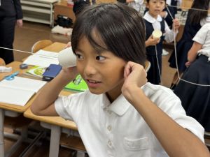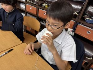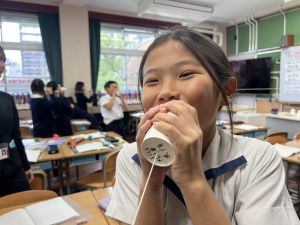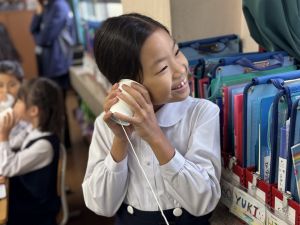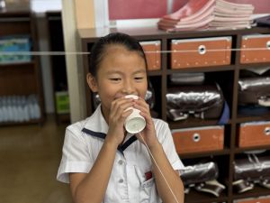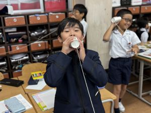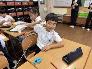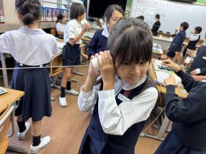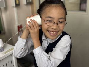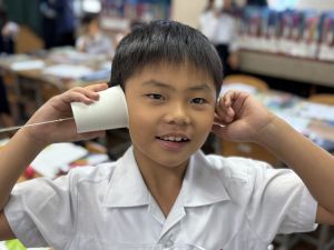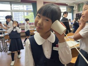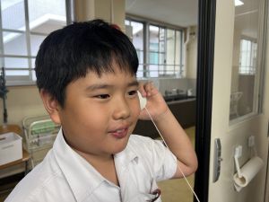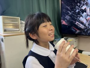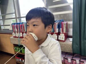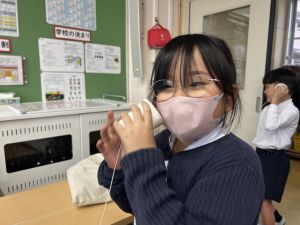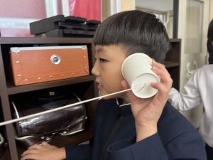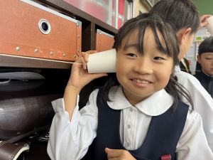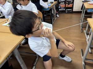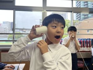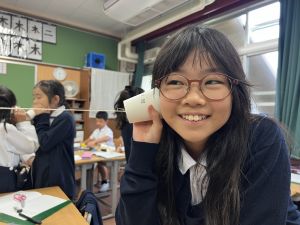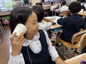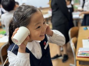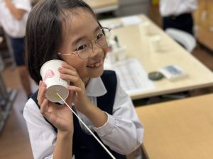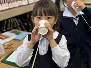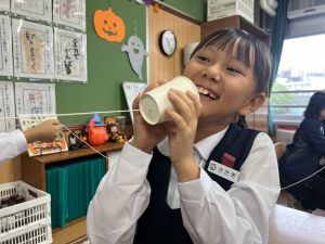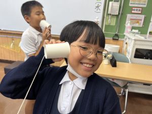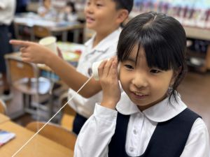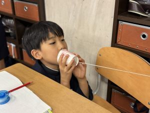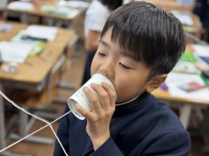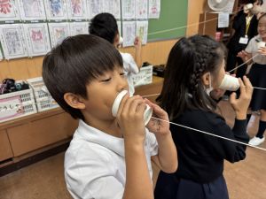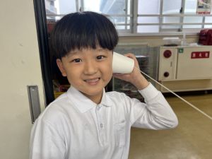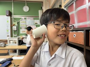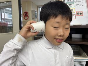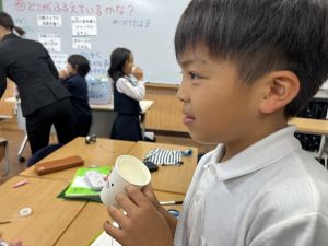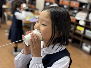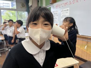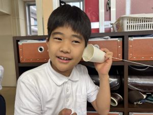 糸と紙コップがつくる世界を、実習の先生の授業の中で楽しみました。