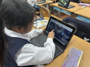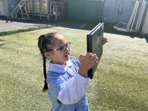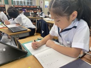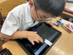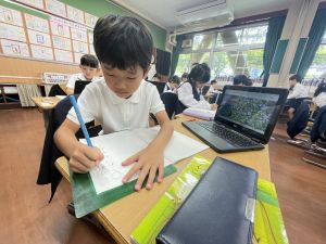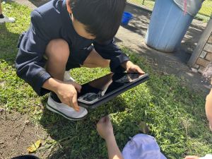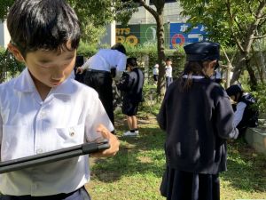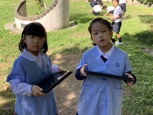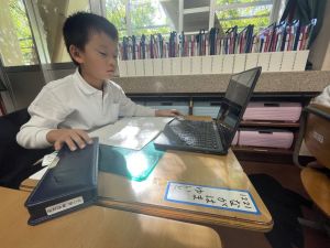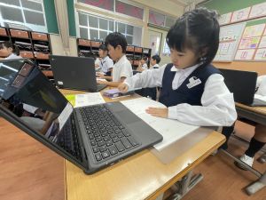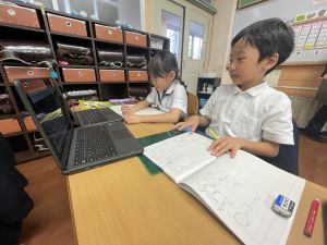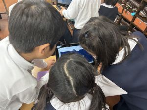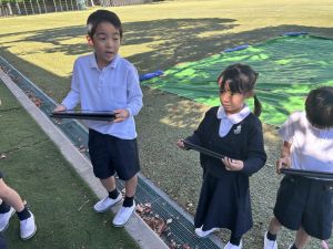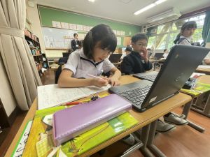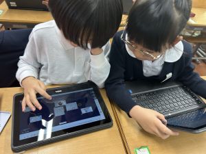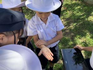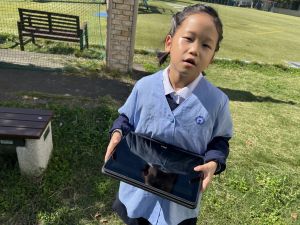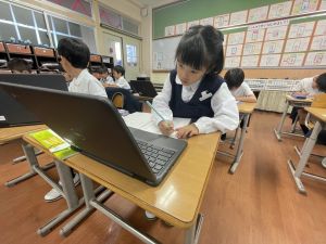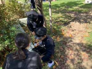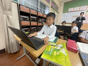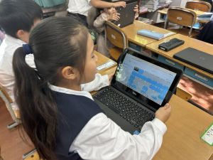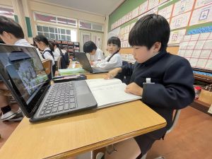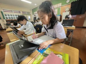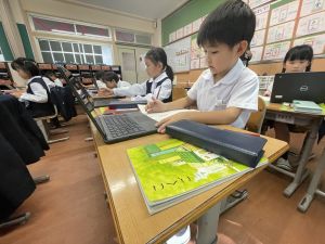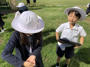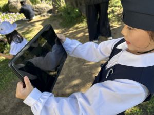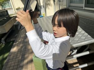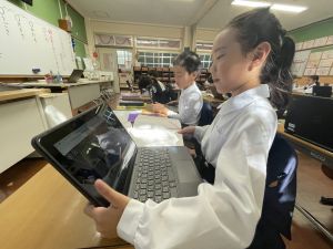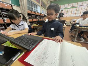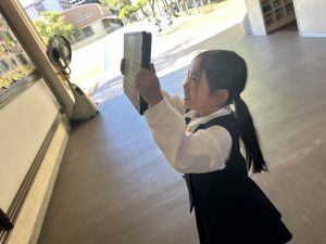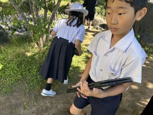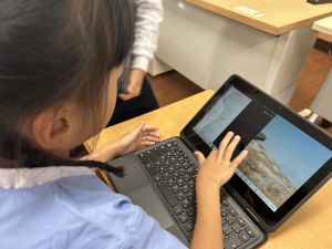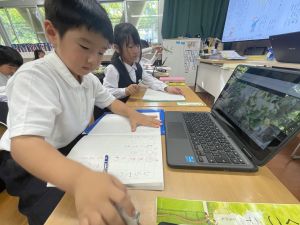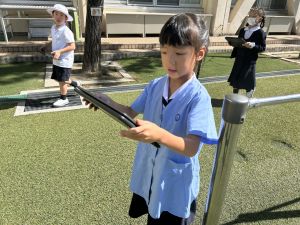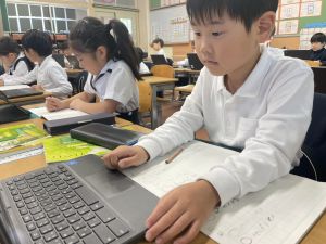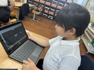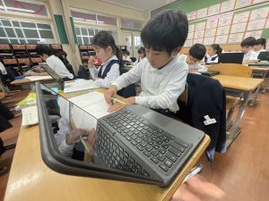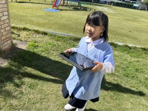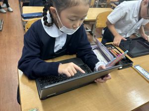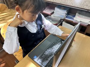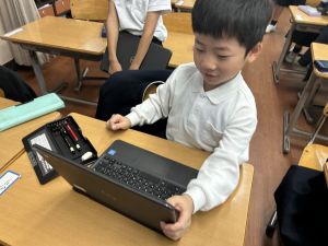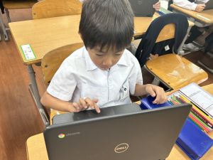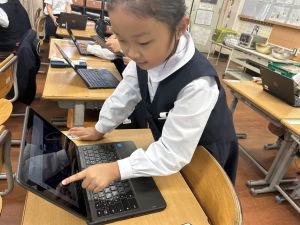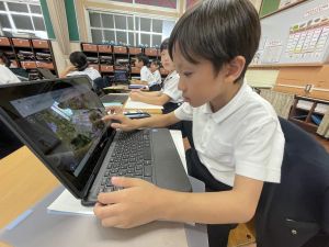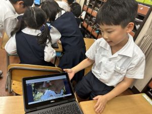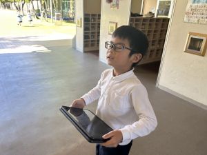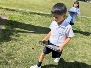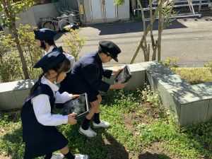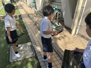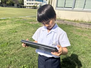 小学校生活も約半年が過ぎ、子どもたちは学校のことをよく知り、自慢したいものがどんどん増えてきました。今回は、Chromebookを活用して、知らせたいものの写真を撮影しに校内を調査しました。