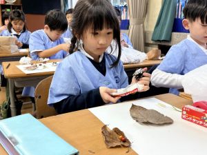 どんぐり、松ぼっくり、イチョウの葉、落ち葉などいろんな秋の道具を使って、自分の表現したいものを作りました。