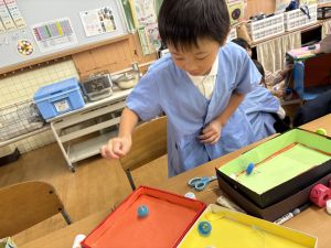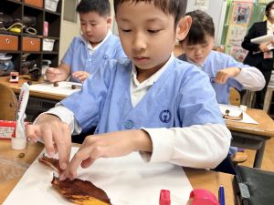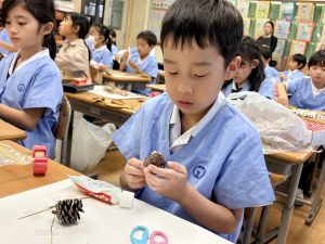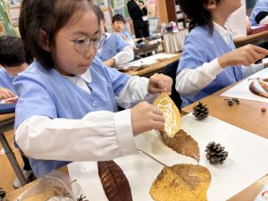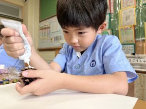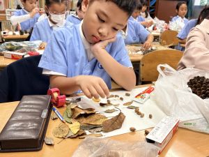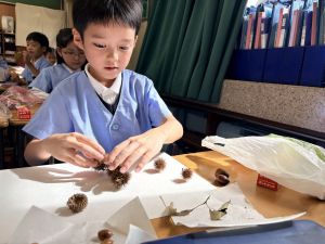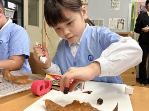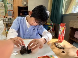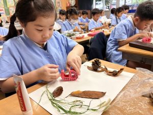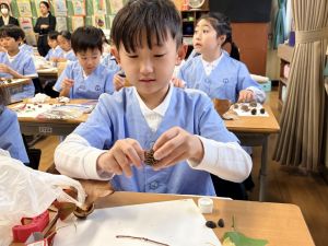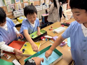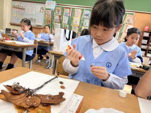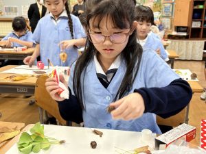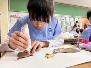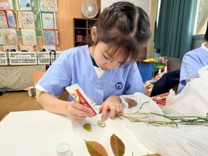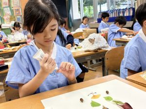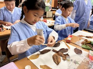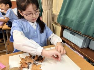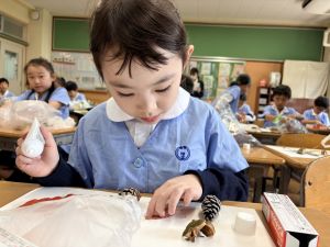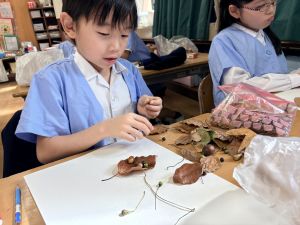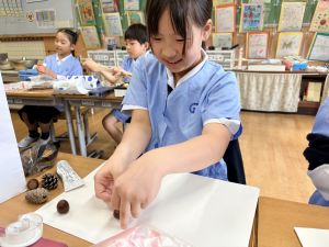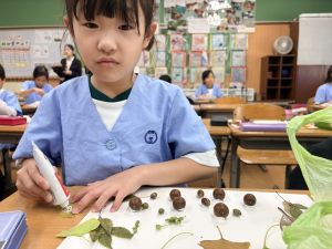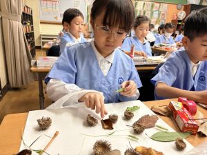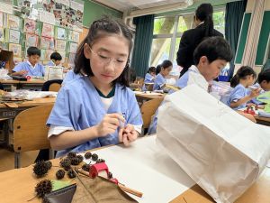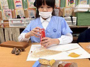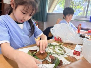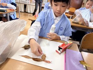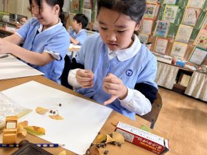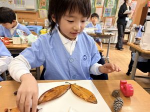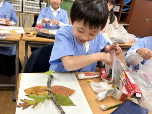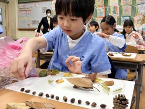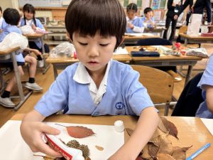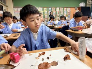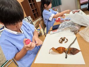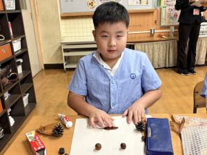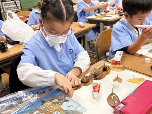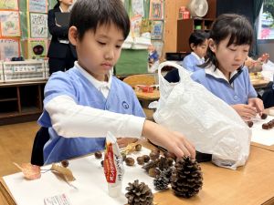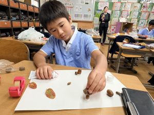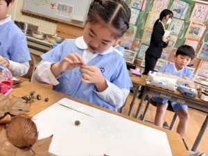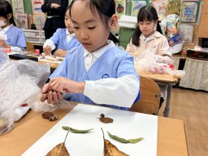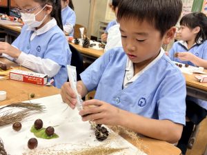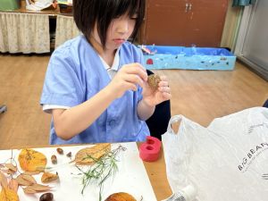 どんぐり、松ぼっくり、イチョウの葉、落ち葉などいろんな秋の道具を使って、自分の表現したいものを作りました。