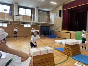 次の時間は、かかえこみ跳びや台上前転などの技にも挑戦します。