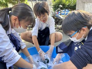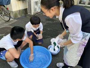 普段は洗濯機でお家の方がしてくれることが多いと思いますが、今日は洗濯板を使って自分の手でゴシゴシと洗いました。冷たい水に思わず「つめたーい!」と声を上げながらも、一生懸命こすって汚れを落とす姿が見られました。