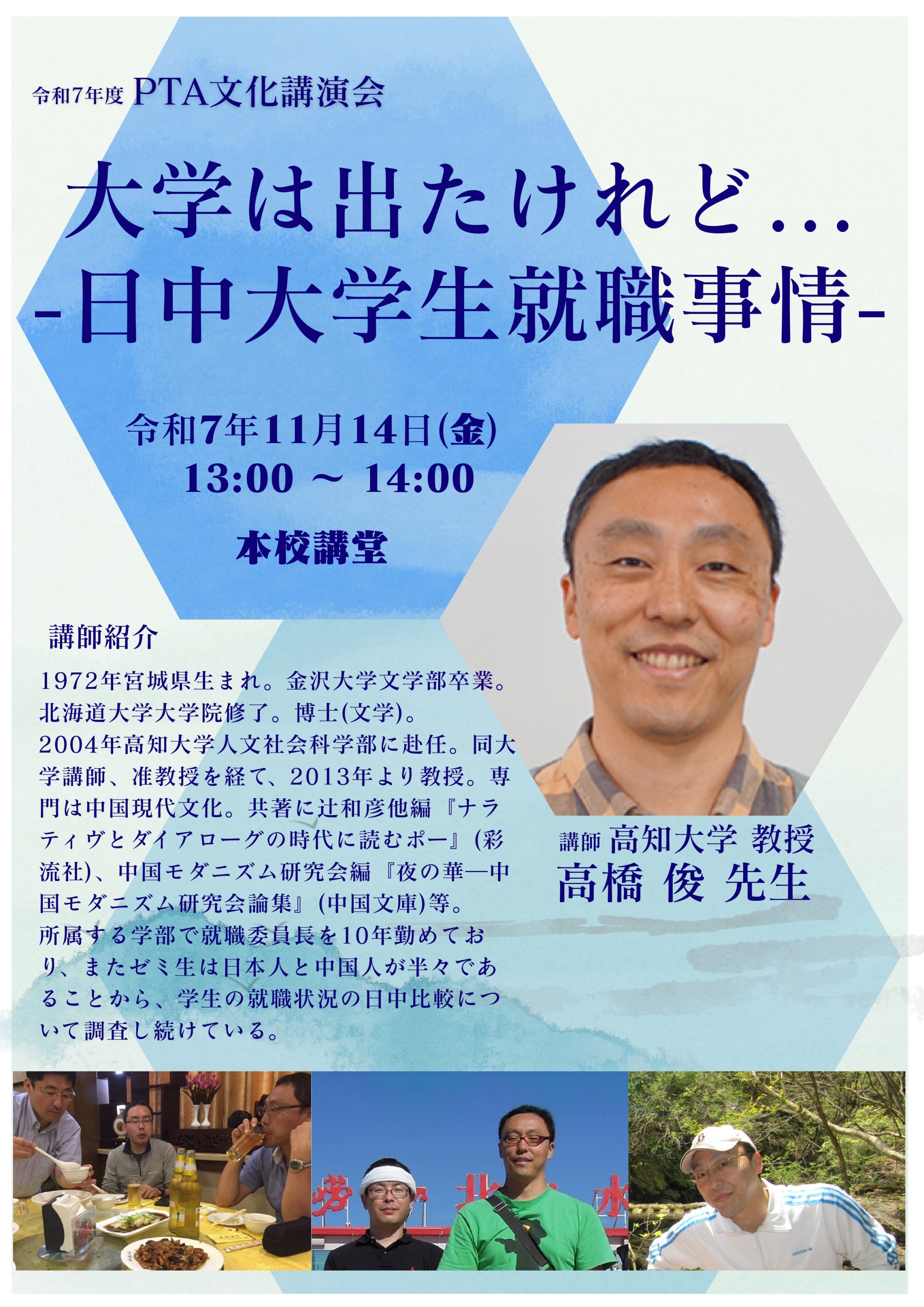 今年度は「大学は出たけれど…-日中大学生就職事情-」と題し、高橋俊先生にご講演いただきます。高橋先生は、中野知洋校長先生の大学時代のご学友でもあり、日中の就職事情について大変示唆に富むお話を伺える貴重な機会となります。