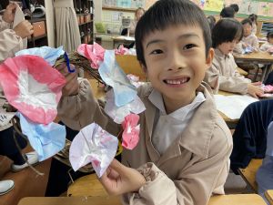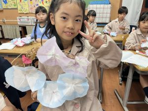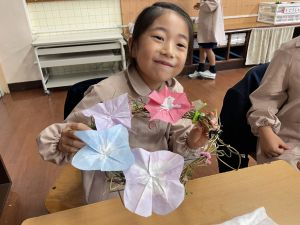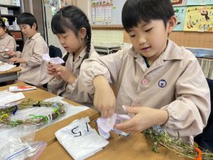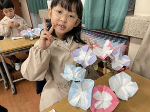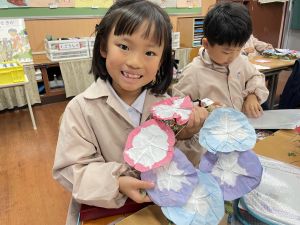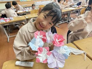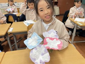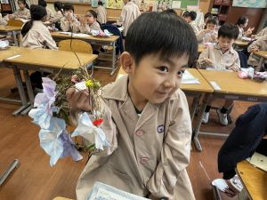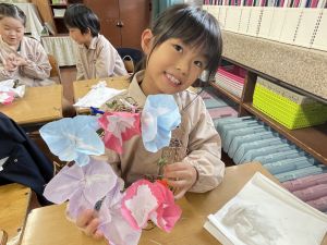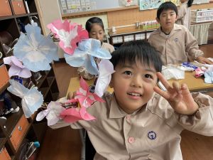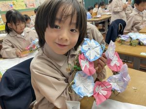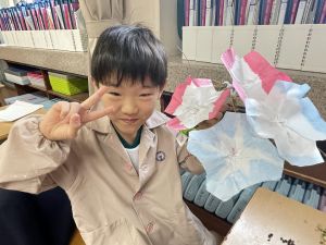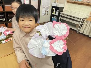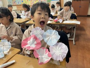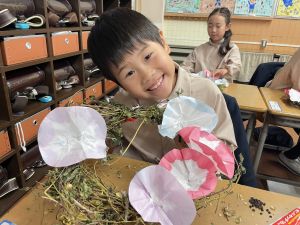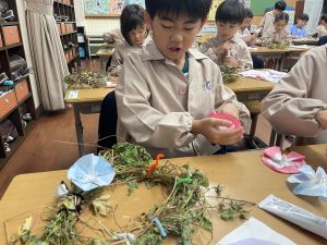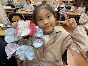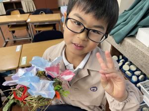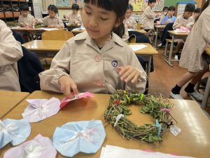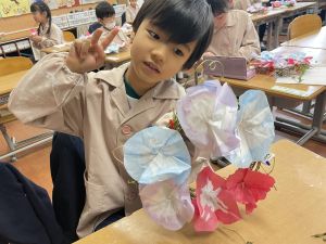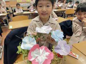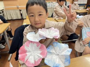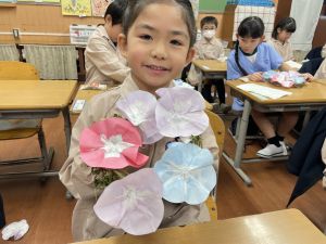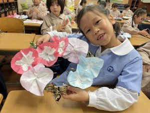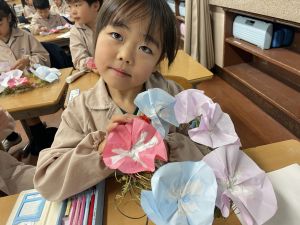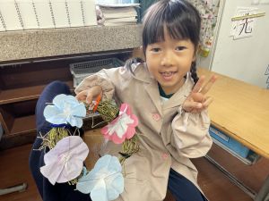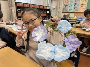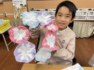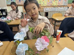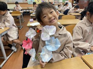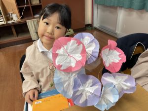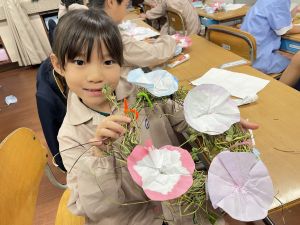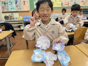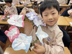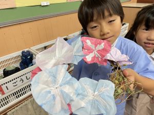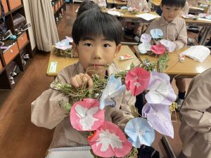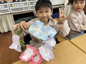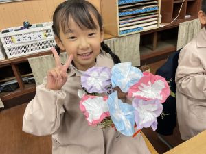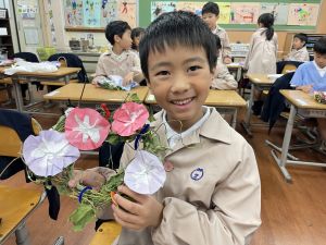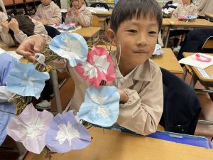 そして、今日の生活の時間には、5月から半年育ててきた朝顔を復活させました。寂しかった朝顔のつるリースにも、きれいなあさがおが満開になり、子どもたちもとてもうれしそうでした。