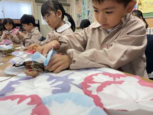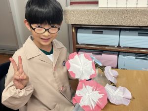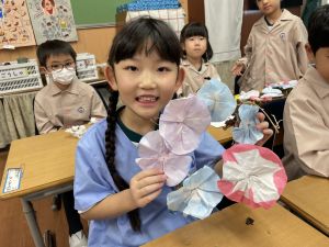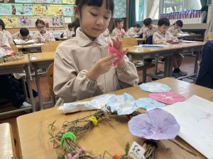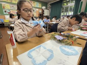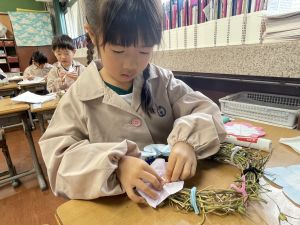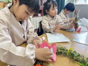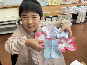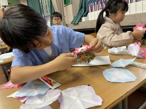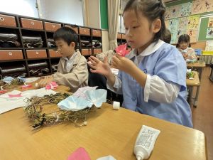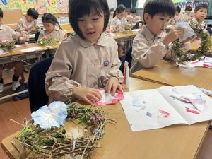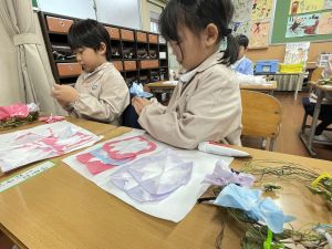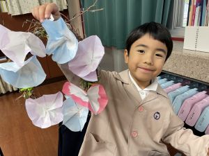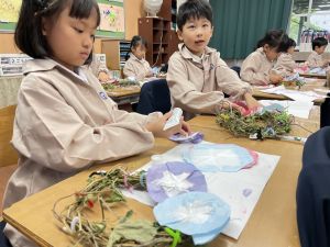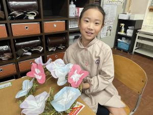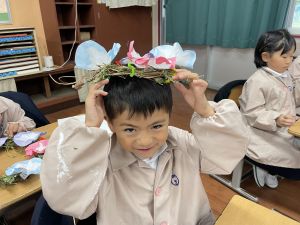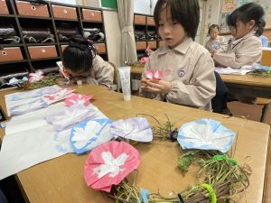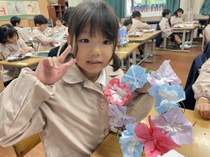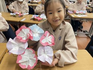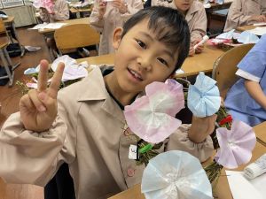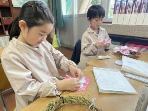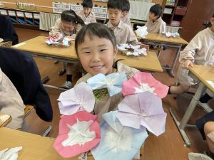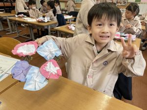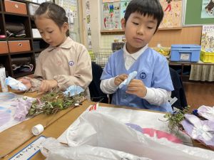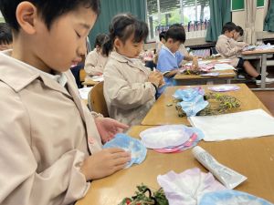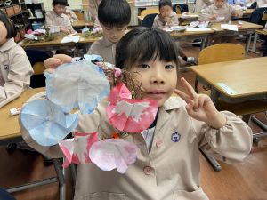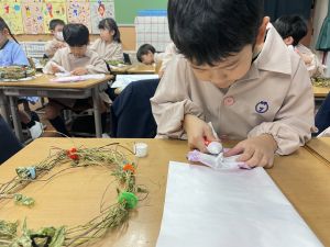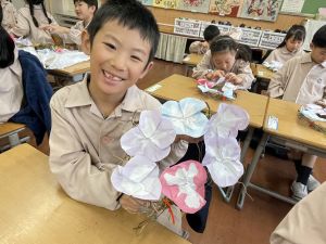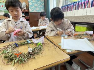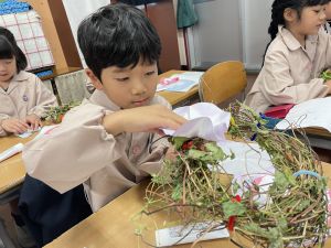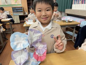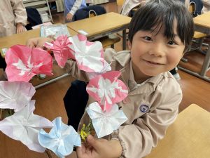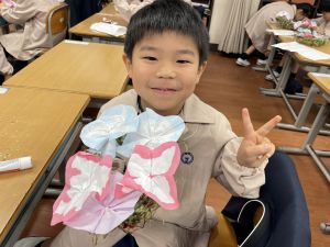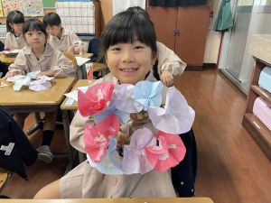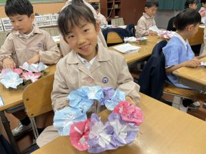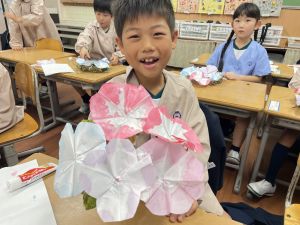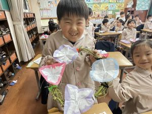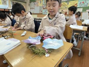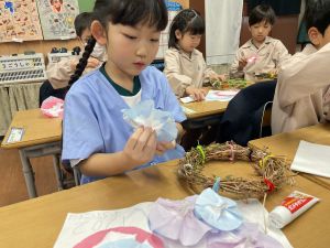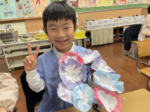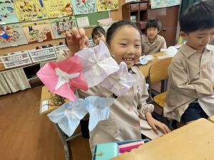そして、今日の生活の時間には、5月から半年育ててきた朝顔を復活させました。寂しかった朝顔のつるリースにも、きれいなあさがおが満開になり、子どもたちもとてもうれしそうでした。