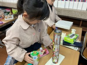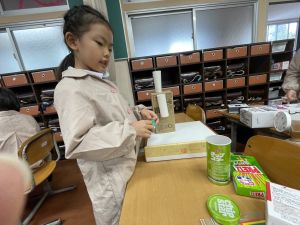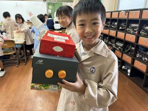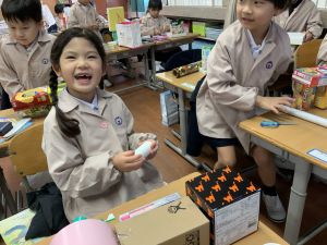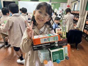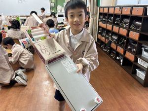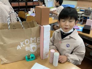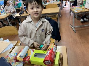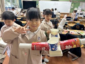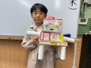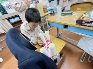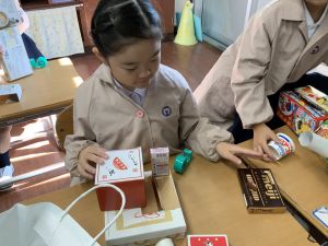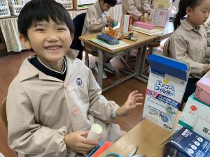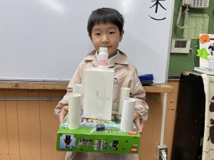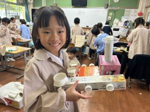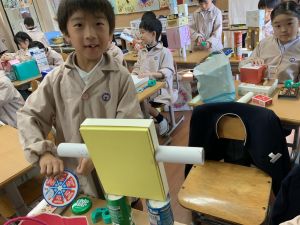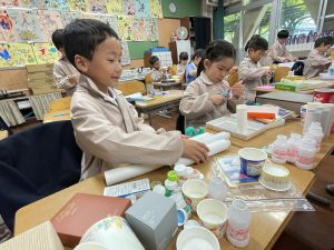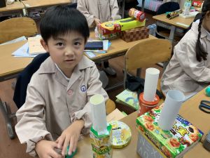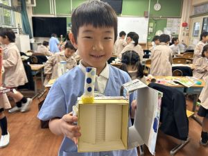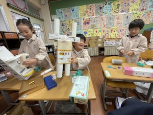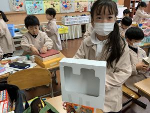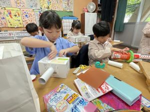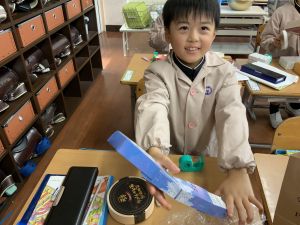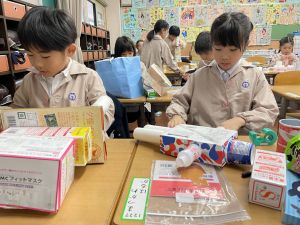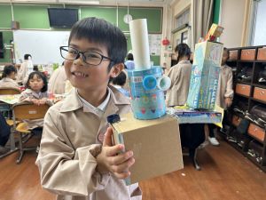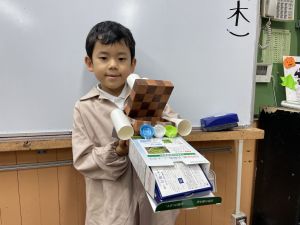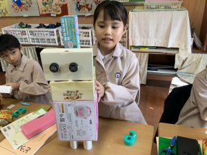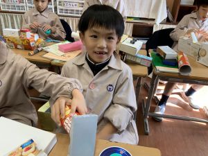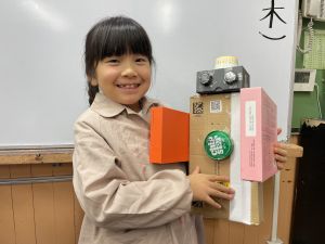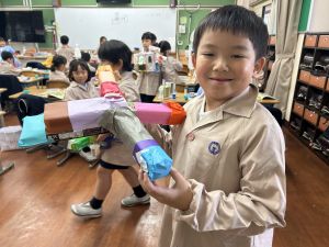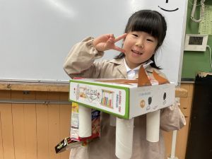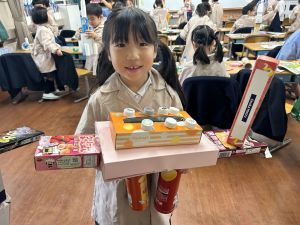 そして本日、図工の学習では、算数で培った知識を活かして「はことはこを組み合わせて、自分が作りたいものをつくる」活動を行いました。