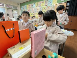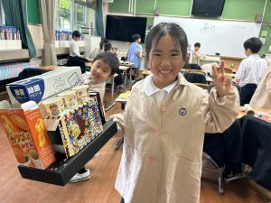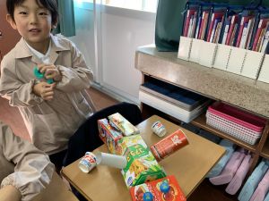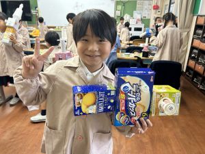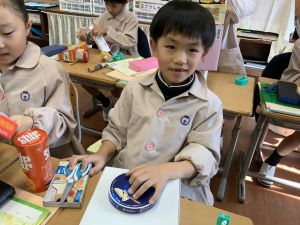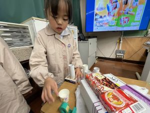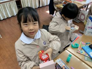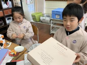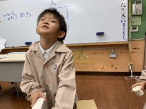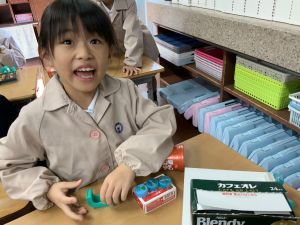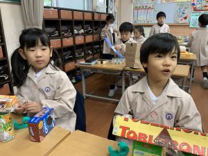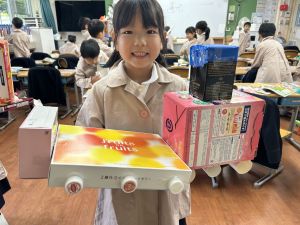 これまで算数科では、さまざまな形について学習を重ねてきました。箱の中にもいろいろな形が隠れていることに気づき、形の特徴や性質(転がる・立つなど)にも目を向けることができました。