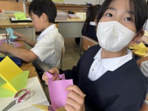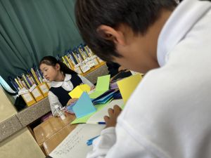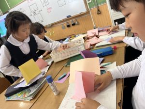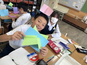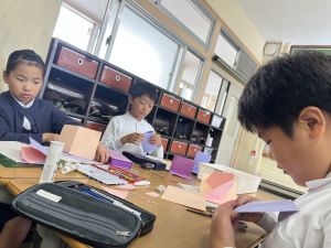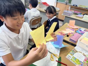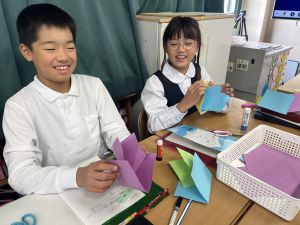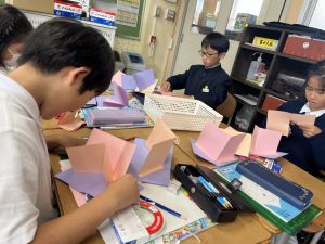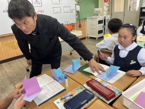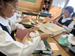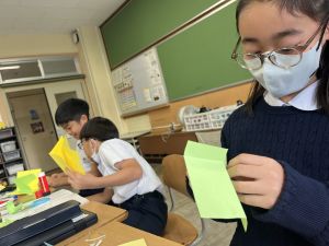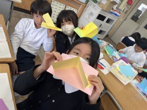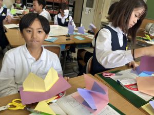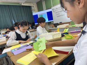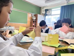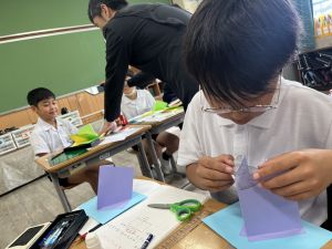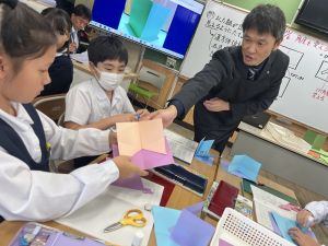 仕掛け絵本を算数的にみることができるとは!金田先生の指導のもと、飛び出す角度を調整できる驚きと面白さに、147期生も釘付けでした。