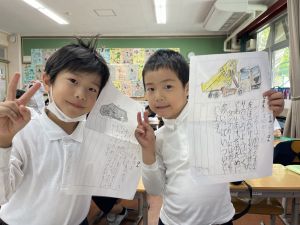 国語の学習「じどう車くらべ」の学習を終え、自分で「じどう車ずかん」を作っています。