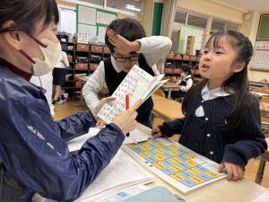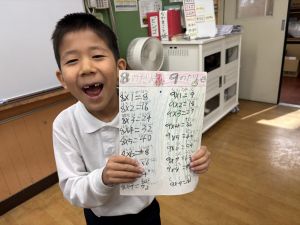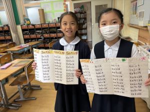 算数では、自分で九九カードを作り、九九を使いこなせるようにすらすら言えるように頑張っています。