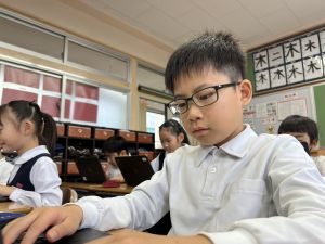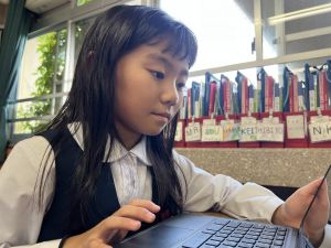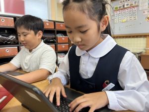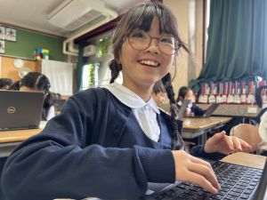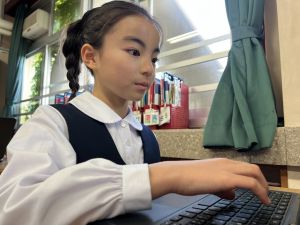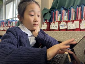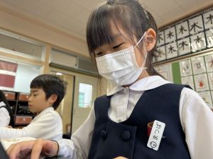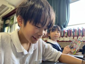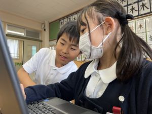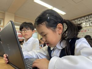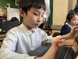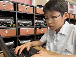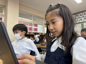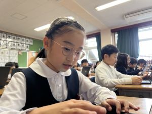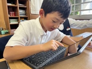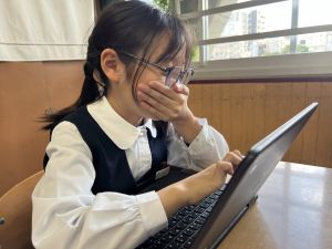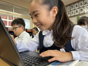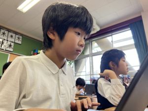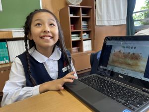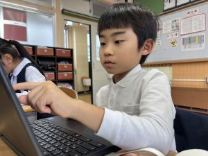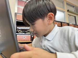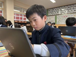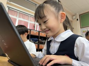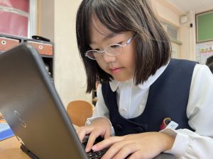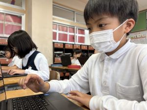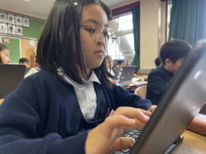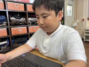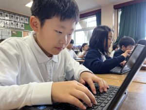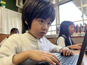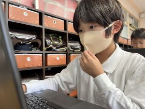 続いて、ポッキーのチョコの部分と同じ色の端末、おっと失礼。クロームブックですね。それを使い、何やら一生懸命な眼差しでがんばる姿があります。