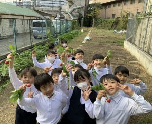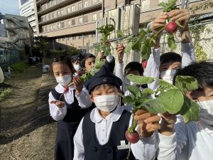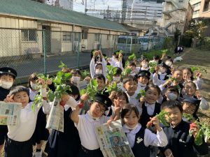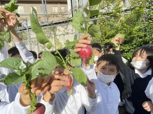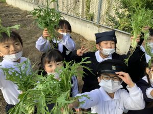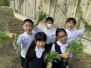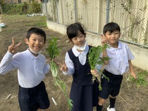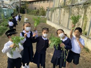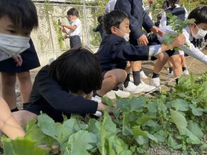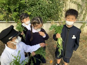 そんな中、今日の5時間目は、ふくろうガーデンのお野菜の収穫に行きました。