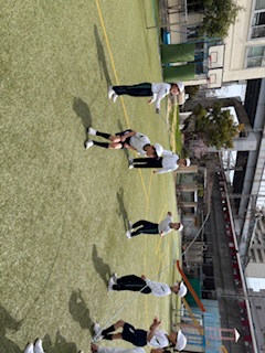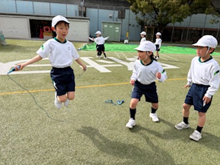 1人で、跳べる技や回数が増えてきました。次のステップとして、お友達と協力して、2人跳びにチャレンジしています。