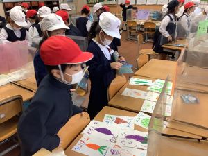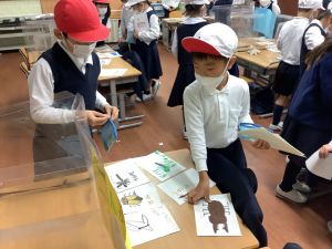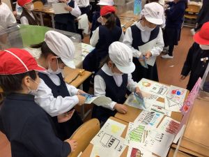 2組では、国語「もののなまえ」の学習で、お店やさんごっこをしました。班ごとに、八百屋さんや楽器屋さん、魚屋さんなどのお店を出しました。お店には、いろいろなものの名前が書かれた品物カードが並びます。お客さんはお小遣いをもって、自分の好きなものをたくさん買ってとても嬉しそうでした。いつもの教室が、商店街に大変身!「いらっしゃいませー!」「おすすめですよ!」「ありがとうございました!」と元気な声が飛び交いました。