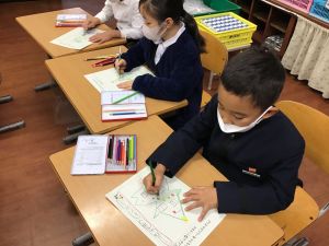今日の図工では、アート展に向けて、クリスマスツリーの計画を立てました。計画書にはかわいい、オシャレな飾りがたくさんかかれています。
