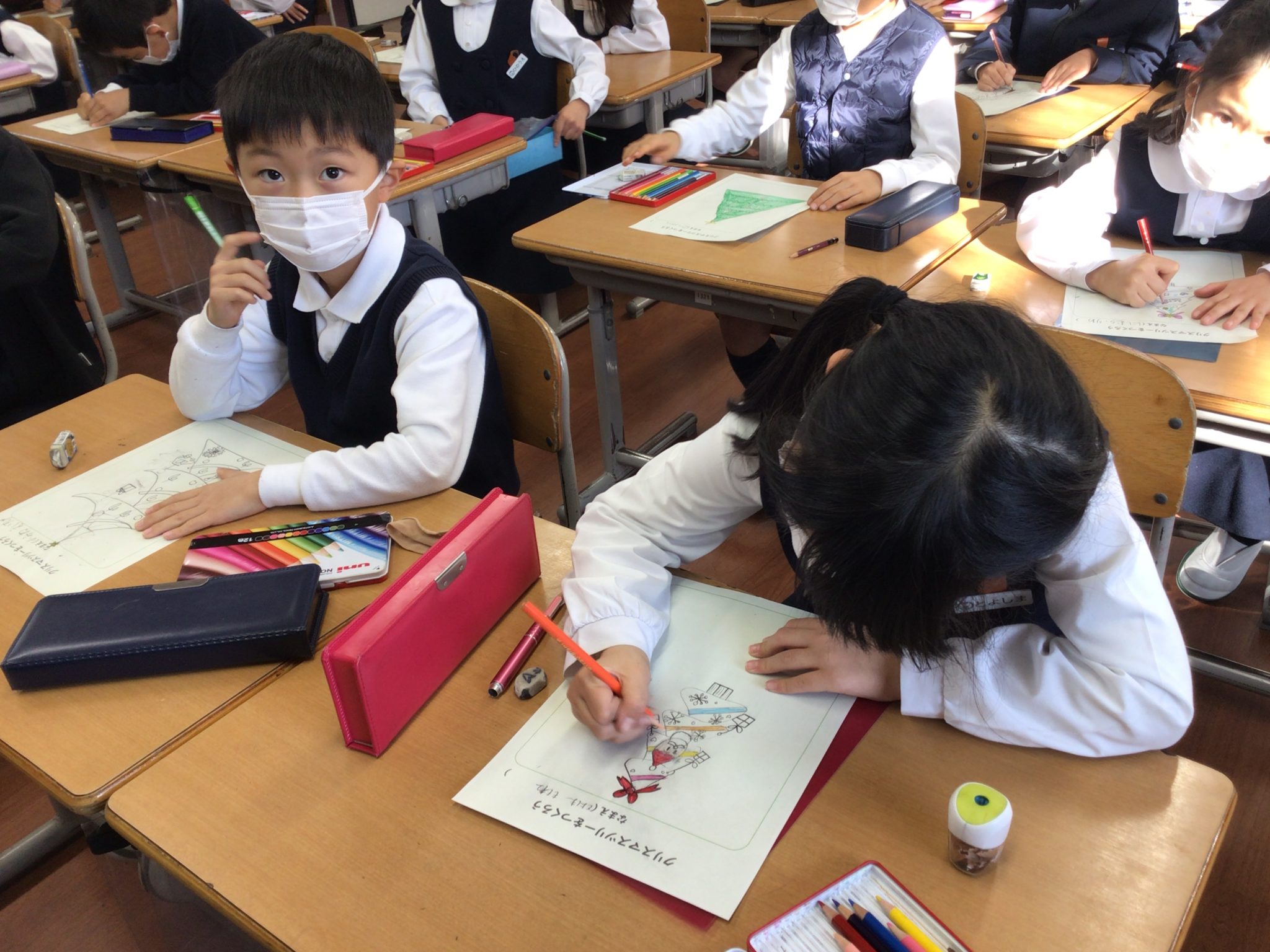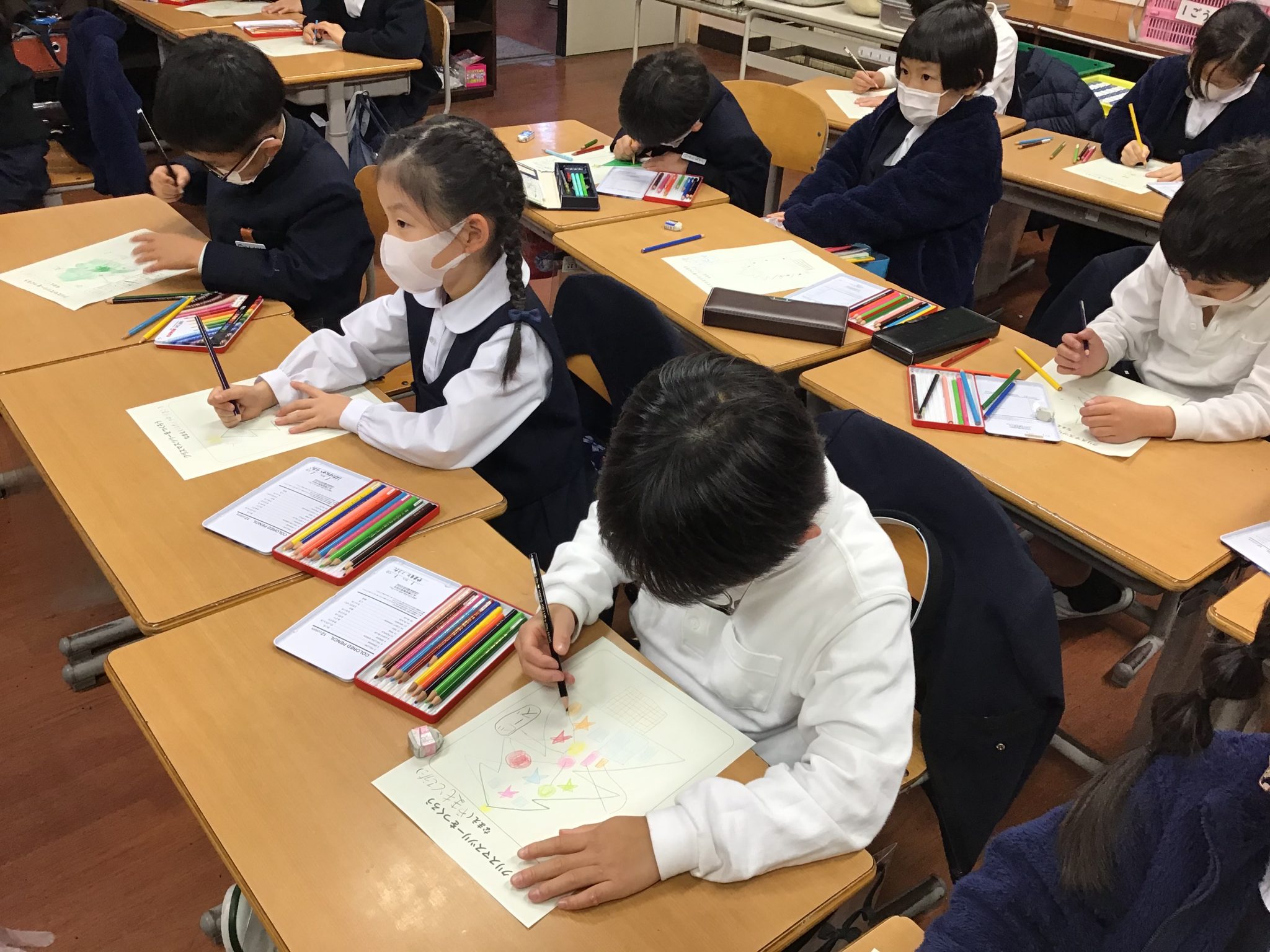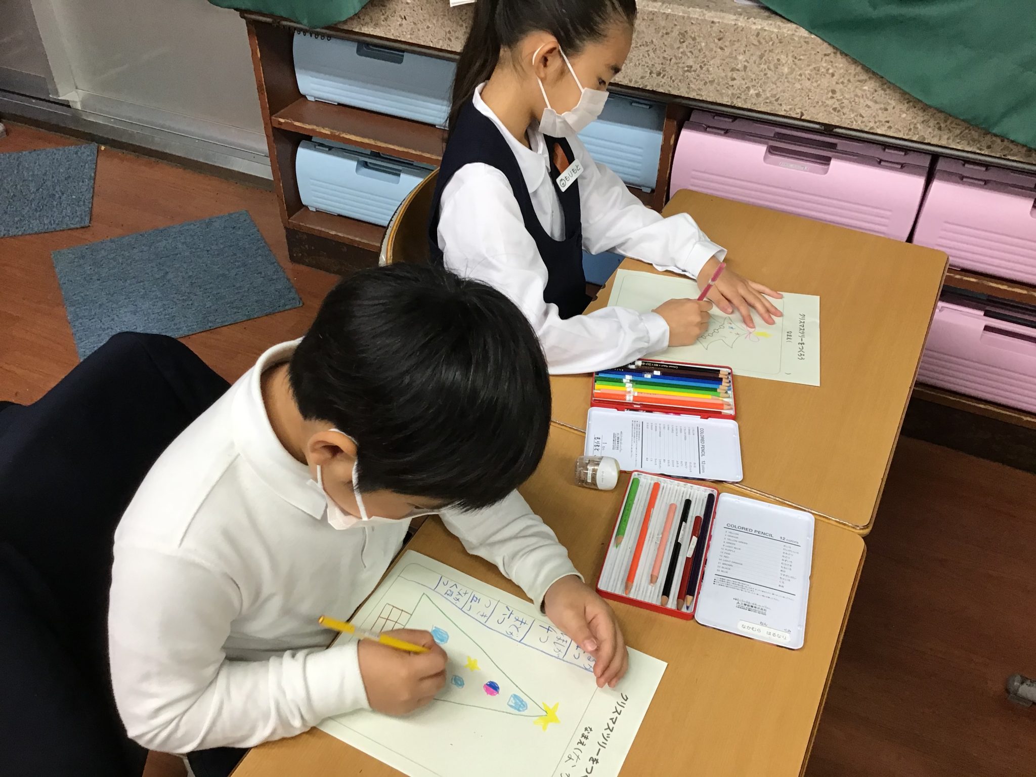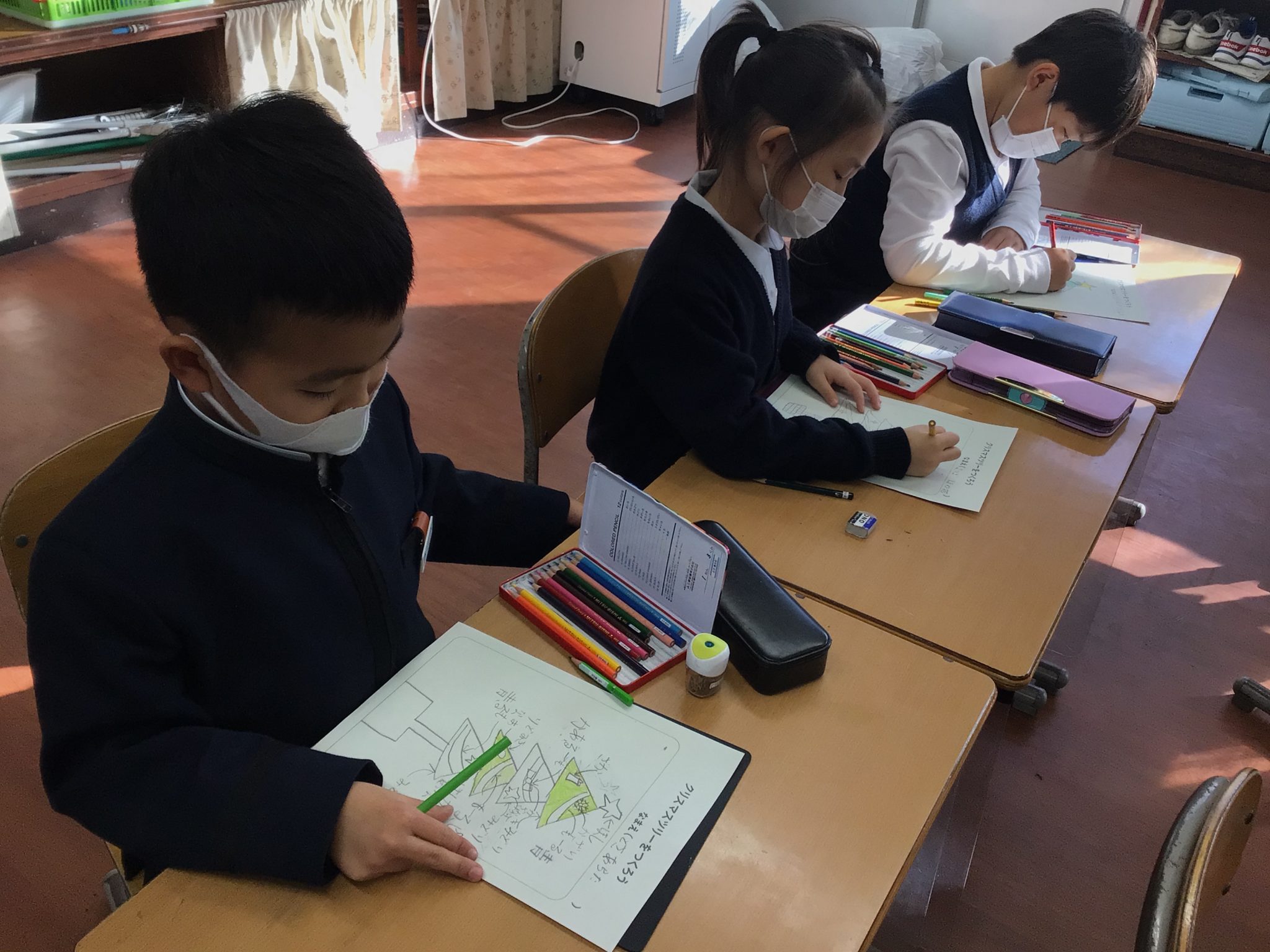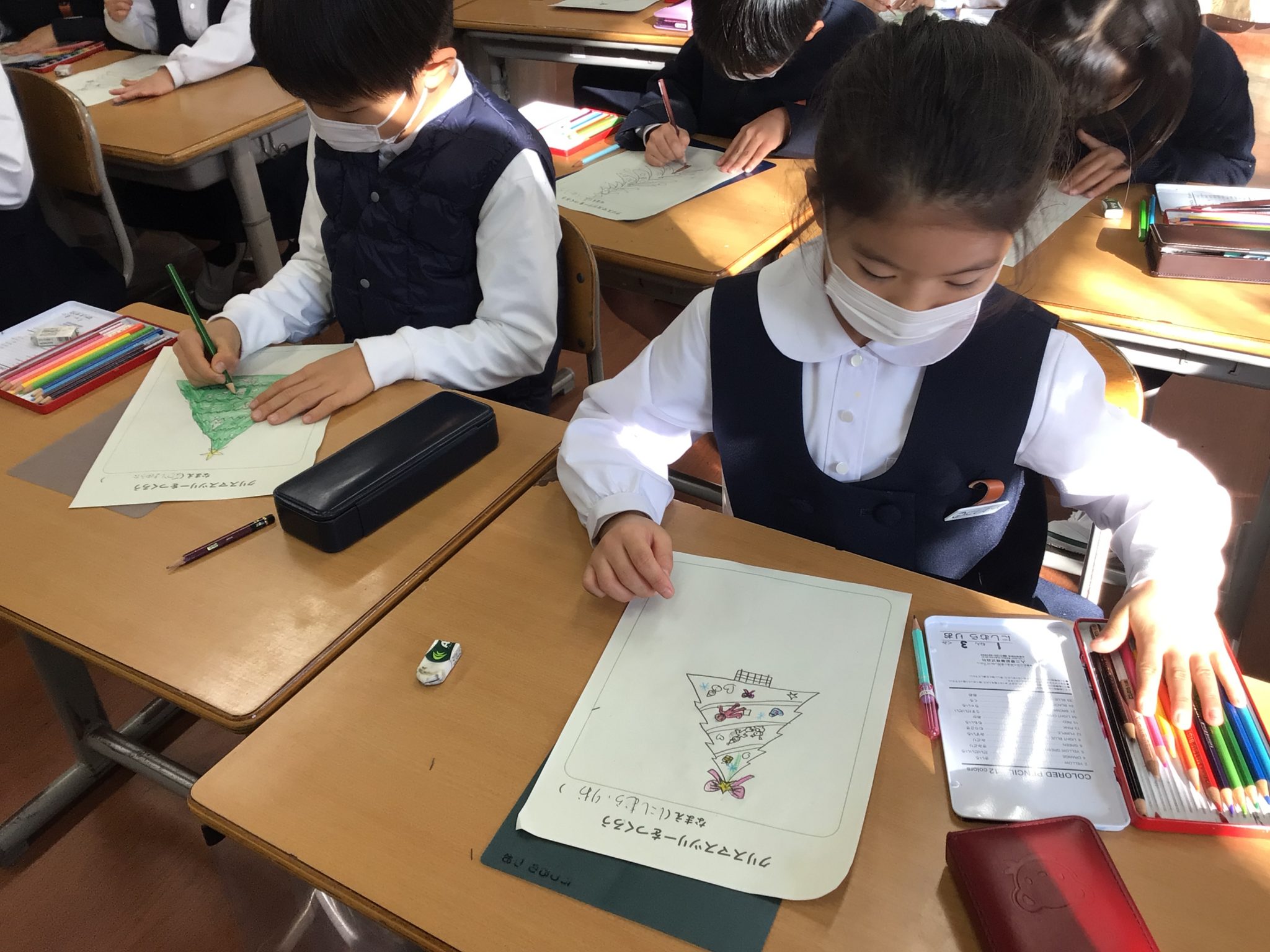 今日の図工では、アート展に向けて、クリスマスツリーの計画を立てました。計画書にはかわいい、オシャレな飾りがたくさんかかれています。
