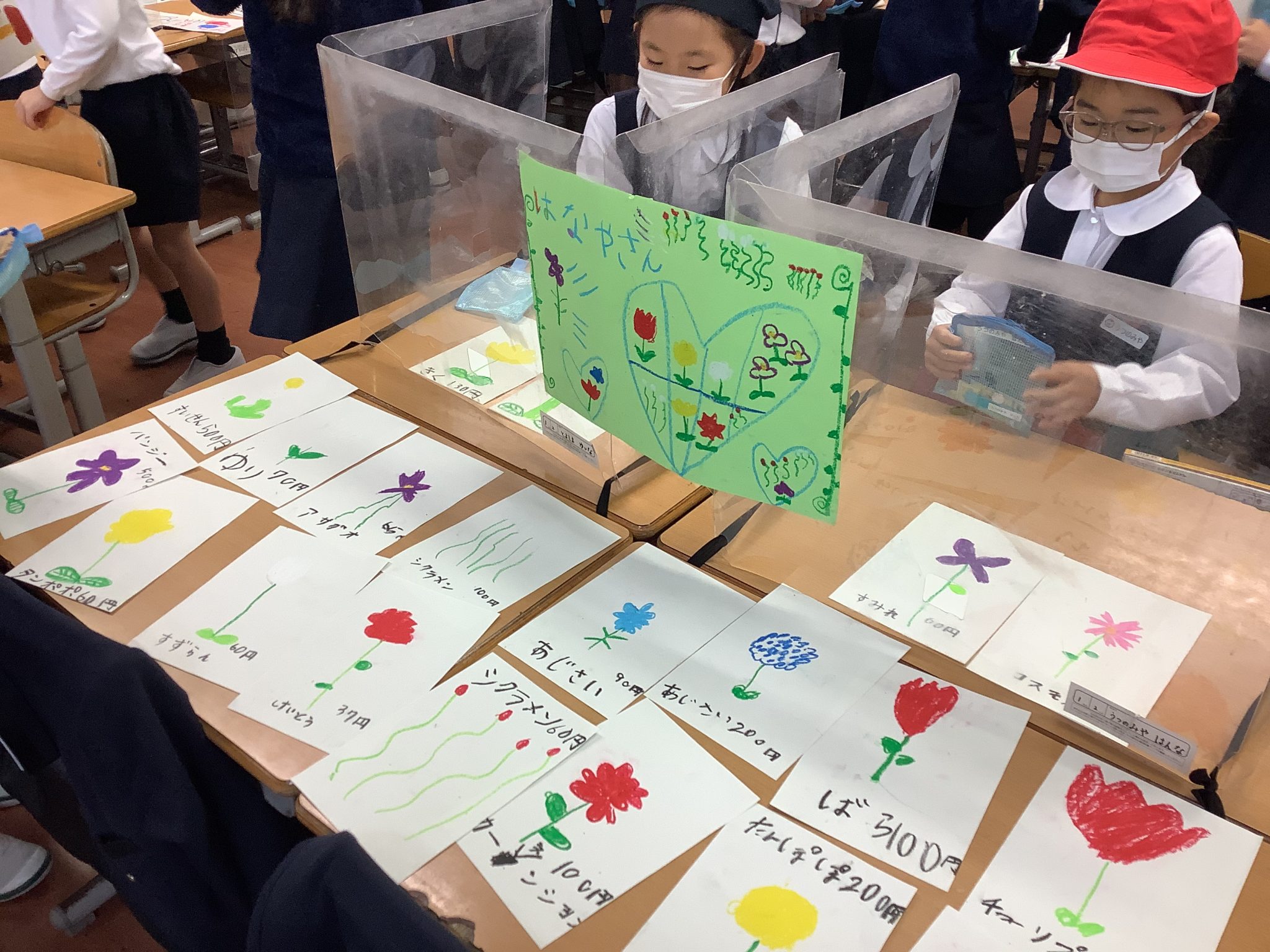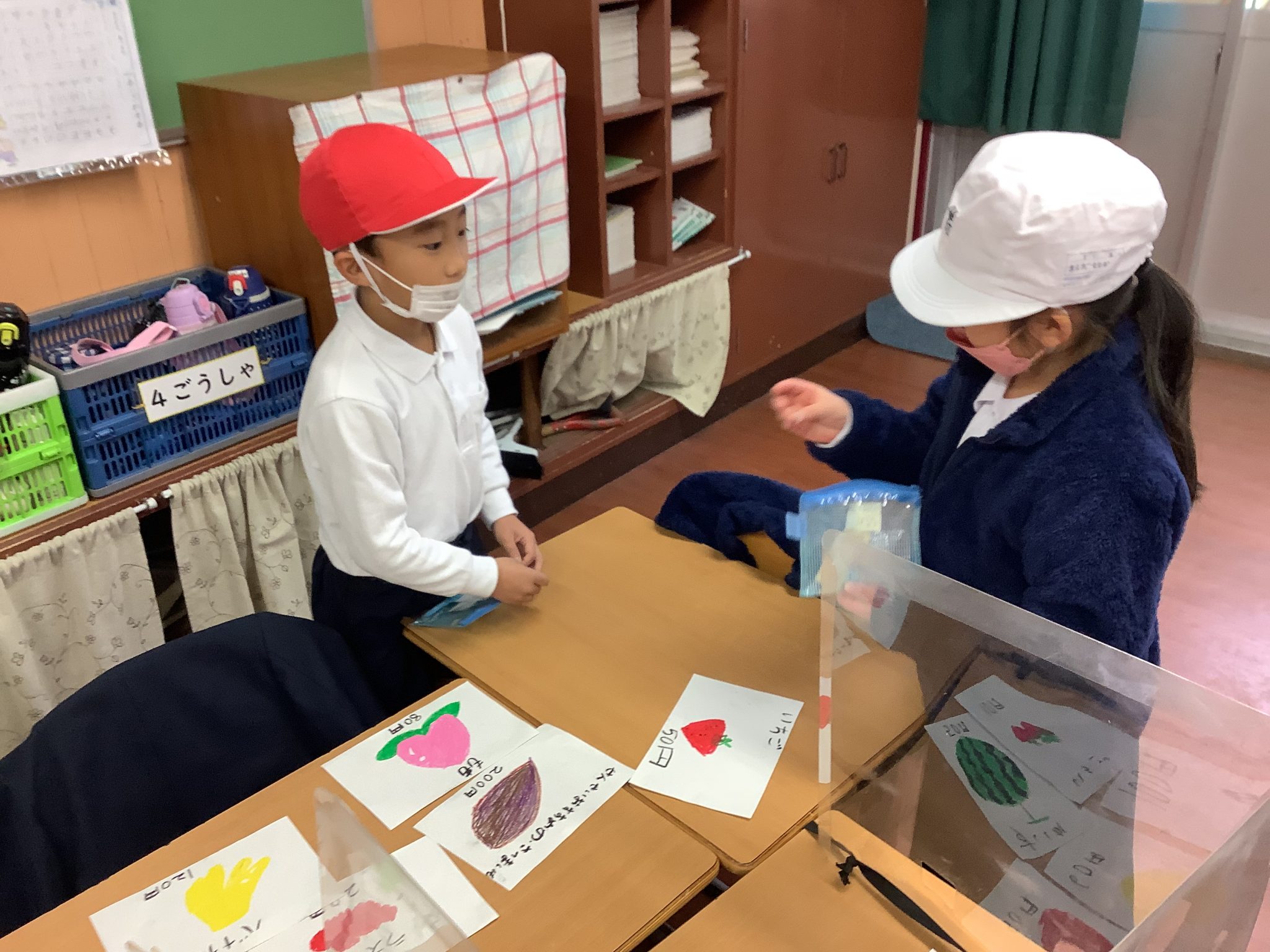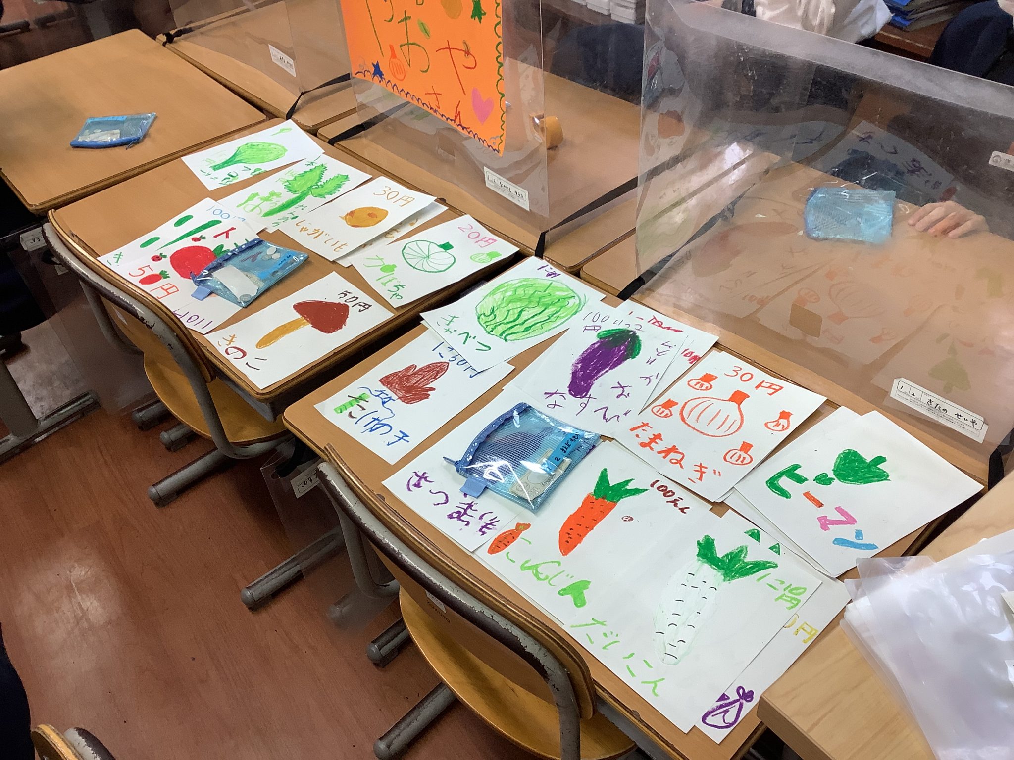 2組では、国語「もののなまえ」の学習で、お店やさんごっこをしました。班ごとに、八百屋さんや楽器屋さん、魚屋さんなどのお店を出しました。お店には、いろいろなものの名前が書かれた品物カードが並びます。お客さんはお小遣いをもって、自分の好きなものをたくさん買ってとても嬉しそうでした。いつもの教室が、商店街に大変身!「いらっしゃいませー!」「おすすめですよ!」「ありがとうございました!」と元気な声が飛び交いました。