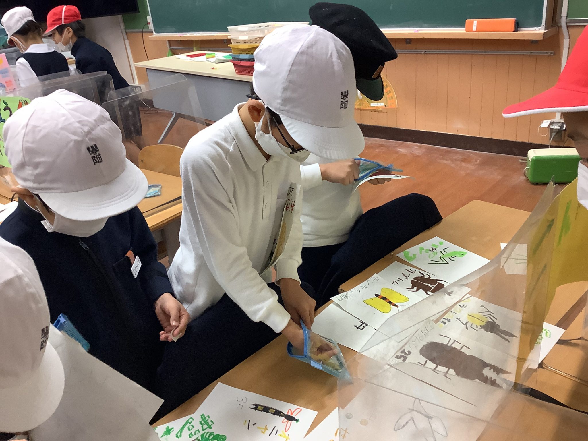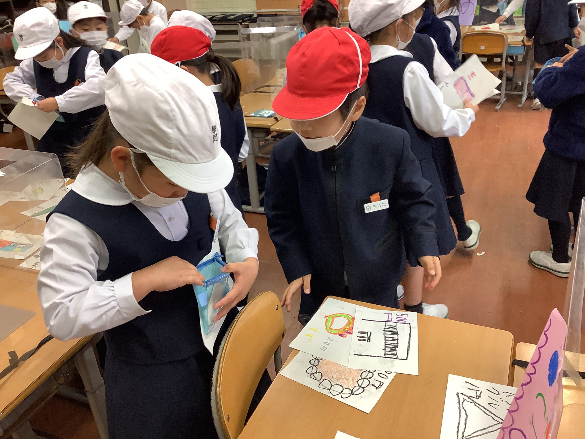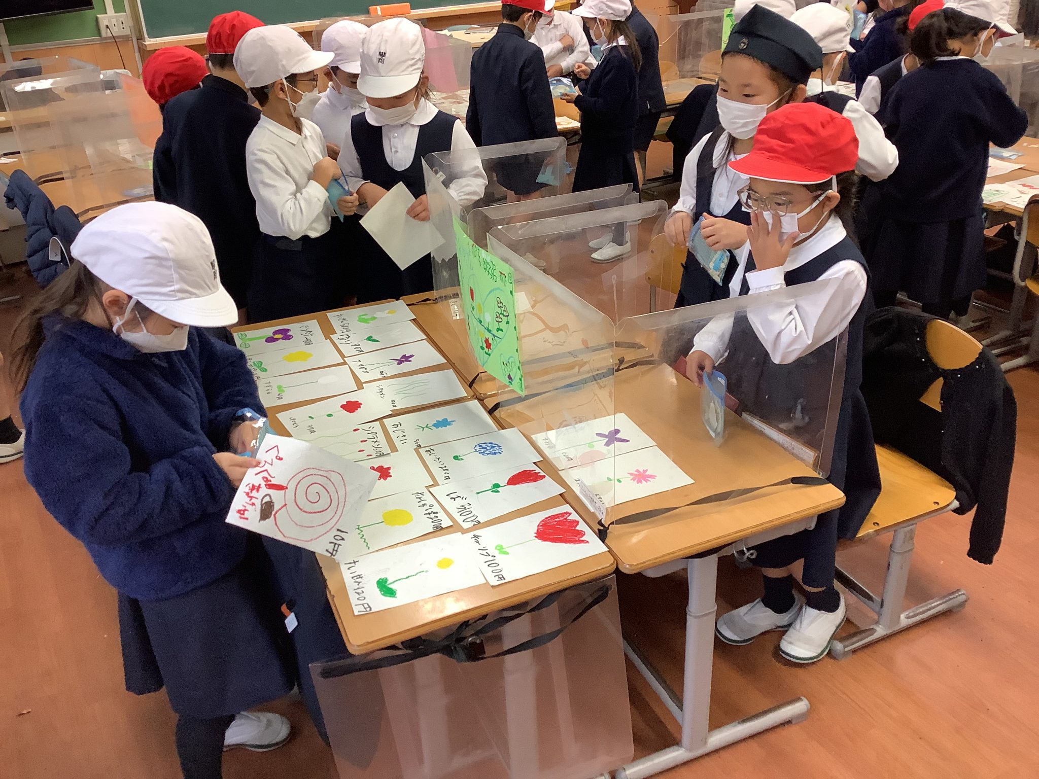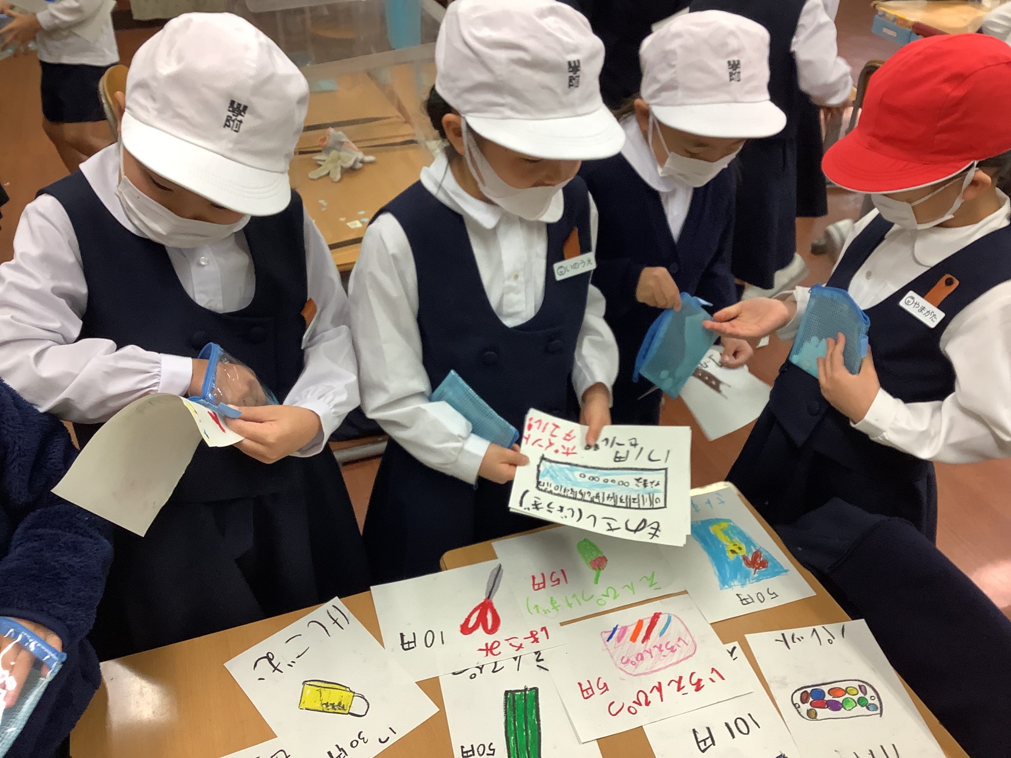2組では、国語「もののなまえ」の学習で、お店やさんごっこをしました。班ごとに、八百屋さんや楽器屋さん、魚屋さんなどのお店を出しました。お店には、いろいろなものの名前が書かれた品物カードが並びます。お客さんはお小遣いをもって、自分の好きなものをたくさん買ってとても嬉しそうでした。いつもの教室が、商店街に大変身!「いらっしゃいませー!」「おすすめですよ!」「ありがとうございました!」と元気な声が飛び交いました。
