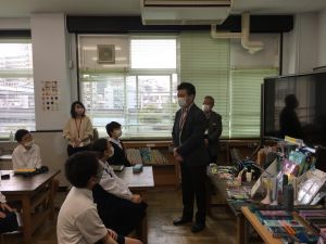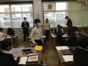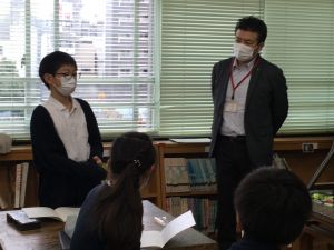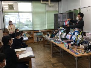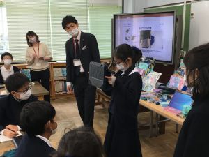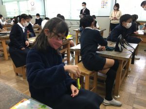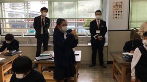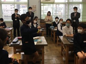 今日の社会の授業は、文房具の会社であるクツワの方に来ていただき,話をしていただきました。以前にクツワで作られた新しいコンパスについて調べました。そのコンパスについて様々な工夫があることや、どうしてそういった工夫を重ねていくのかについて話を聞かせていただきました。