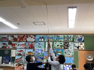 算数では、1mものさしを使って、身の回りにあるものの長さを測りました。どのくらいの長さか予想を立てて、実際に測ってみると…。