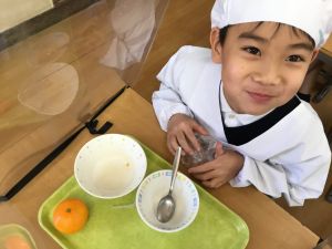 今日の給食は、久しぶりのパン食。珍しいクロワッサンでした。「おいしい、おいしい」と、ぺろりと食べていました。みんな、いい笑顔!!