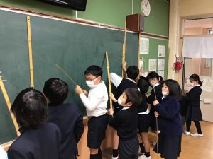 算数では、1mものさしを使って、身の回りにあるものの長さを測りました。どのくらいの長さか予想を立てて、実際に測ってみると…。