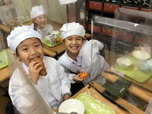 今日の給食は、久しぶりのパン食。珍しいクロワッサンでした。「おいしい、おいしい」と、ぺろりと食べていました。みんな、いい笑顔!!
