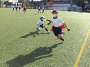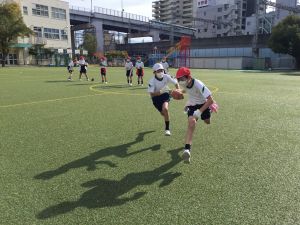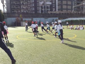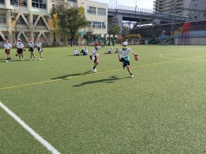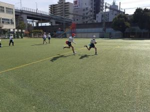 まずは、タグ取り鬼ごっこや1対1の突破ゲームをします。フェイントをかけ、トップスピードで抜き去る練習になります。空いているスペースを見つけてスキを衝いたり、向かい合って突破していくといった様々な場面の身のこなしがタグラグビーに繋がります。