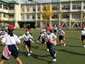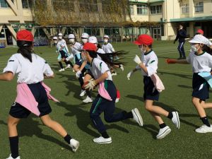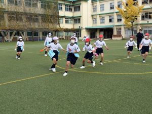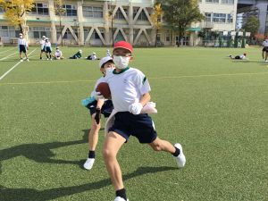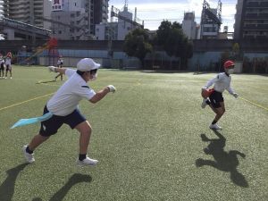 今週の体育では、タグラグビーを行いました。タグラグビーは、ラグビーのタックルの代わりにタグをとって相手の動きを止めるスポーツです。