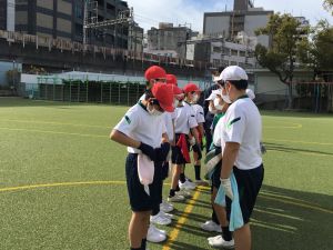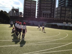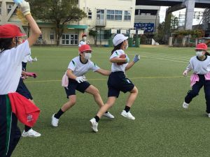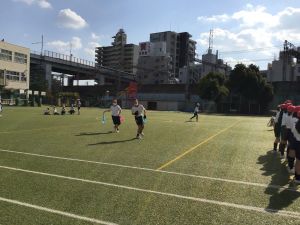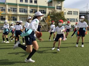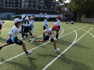 そして、タグラグビーの試合を行います。タグを取られてもパスをして、チームで協力してトライを目指していきます。