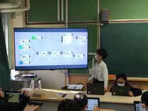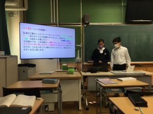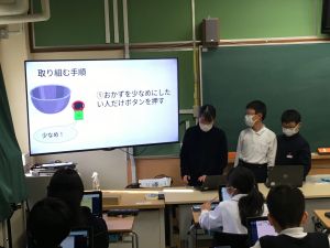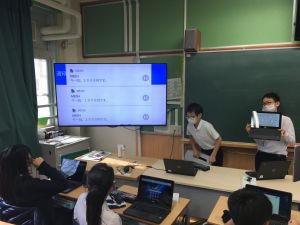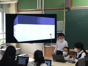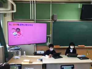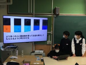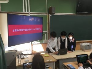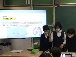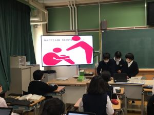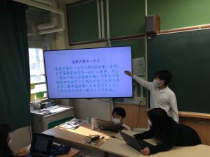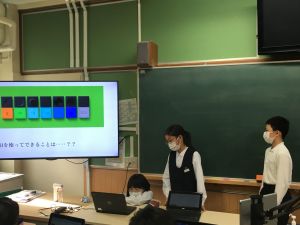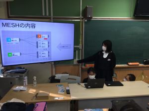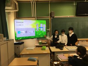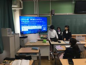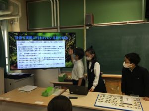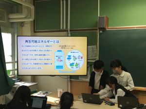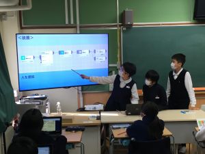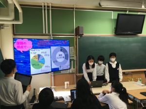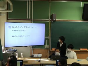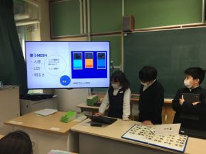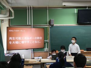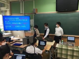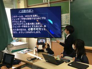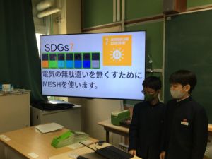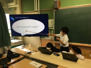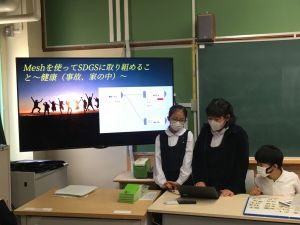 総合的な学習の時間ではMESHを使って、SDGsを実現するにはどんなことができるかを考えてきました。そこで、先週から今週にかけて、各クラスで中間報告会を行いました。