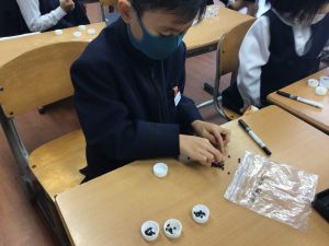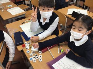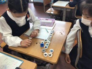 そして、10ずつに分けたたねをペットボトルキャップに入れていくと、すっきりして、とても見やすくなりました。100は10が10こ集まった数、という実感がもてたようでした。