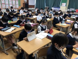今日の国語は、休校時のオンライン学習でした「楽しかったよ、二年生」の続きをしました。オンラインのときに作成した課題のシートを活用しながら、今日は文章の組み立てを考えました。教科書の見本の文章を参考に、「はじめ」と「おわり」のつながりを考えながら、自分の伝えたいことに合わせて書いていきました。多くの子は「はじめ」「おわり」はできましたが、「なか」の部分は、まだできていません。「なか」を考えて原稿を仕上げることが、明日の「読み・書き・算・音タイム」の課題です。「なか」の部分は、経験したことを具体的に順序立てて書いていきます。そこに、その人らしさが表れてきます。どんな「なか」ができるのか、楽しみですね。