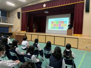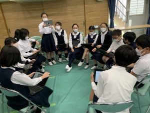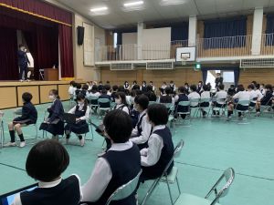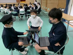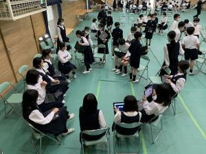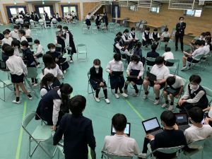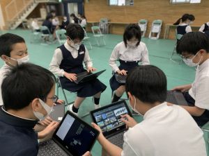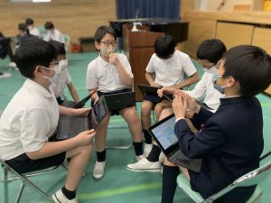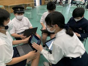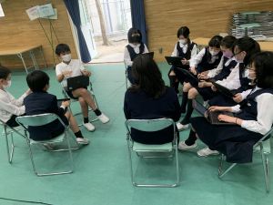 今日は、学年全員でロイロノートを使って、自分の考えを交流しました。そのあとに、自分の考えと近い人たちで集まって、いろいろな話をしながら、考えを広げたり深めたりしていました。ずっと同じメンバーで話すのではなく、場合によってメンバーを変えて話したり、さらに限定してより少人数ではなしている人たちもいました。子どもたちから